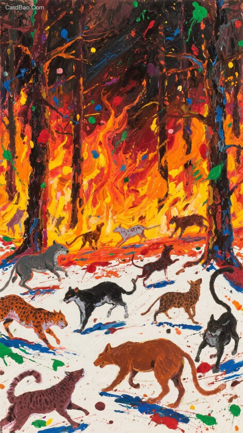 Jackson Pollock, burning forest, fleeing animals, high-saturation colors.