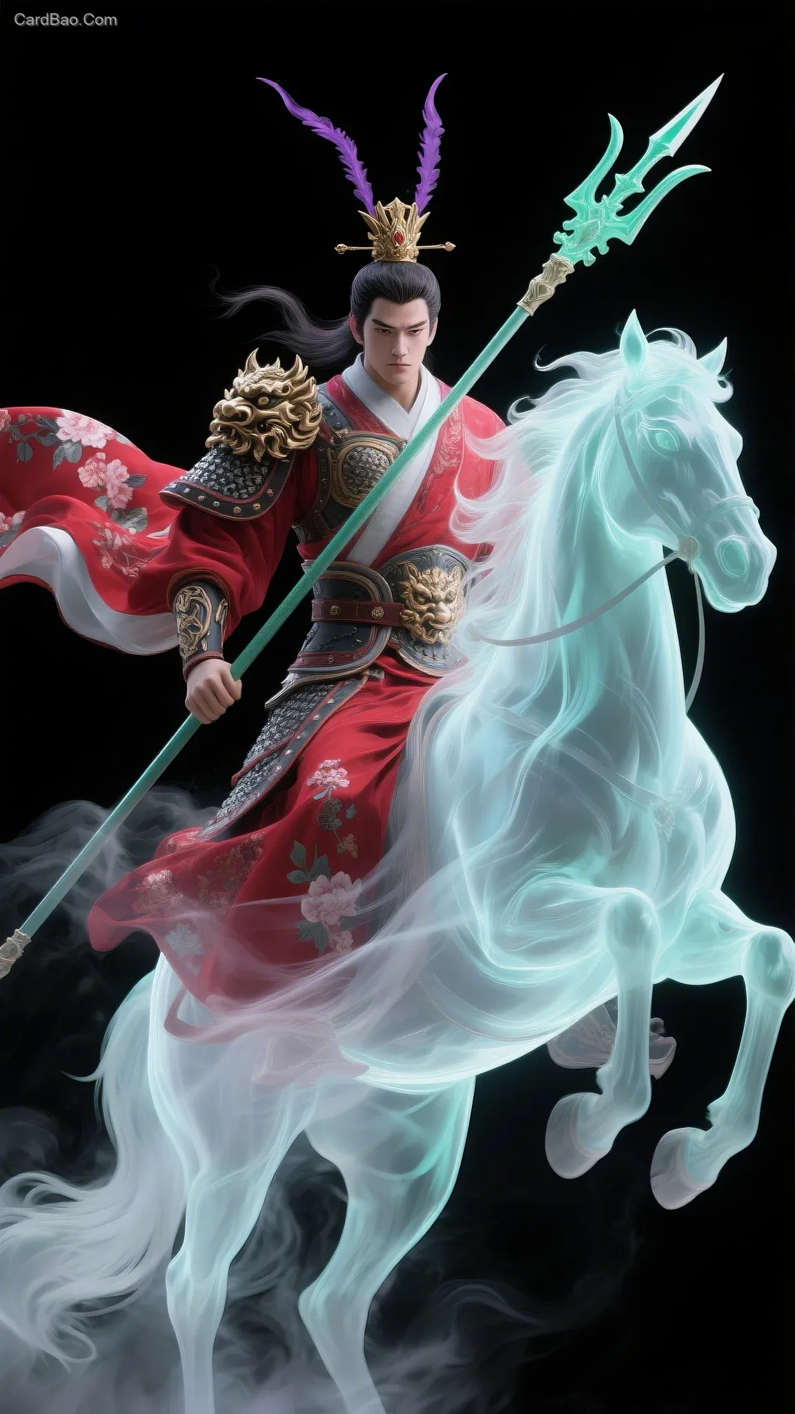 Ink wash painting, formed by neon smoke, a heroic and spirited Lü Bu in frontal view, wearing a three-pronged purple-gold headdress, dressed in a Western Sichuan red brocade robe with floral patterns, clad in beast-faced chainmail armor, with an exquisite lion-head belt around the waist, riding a leaping warhorse, wielding the Azure Dragon Crescent Blade, translucent, close-up, frontal shot, lines as soft, natural, and flowing as water, stream of consciousness, minimalist, ink-wash aesthetic, smoky texture, dreamy, surrealistic, 3D, elegant, motion blur, filamentous streaks, Zen-inspired, ethereal, abstract, pure black background, strong color contrast, 32K resolution.