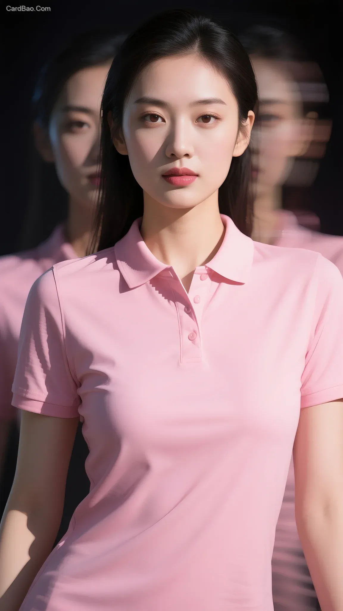 中国美人穿着合身粉色休闲polo衫,面容精致知性,身材匀称,超写实风格,强烈明暗对比,多重曝光效果,像素多重晕染技法呈现通透感,OC渲染技术打造写实光影,32K分辨率细节,整体画面具有视觉冲击力和高级调性,