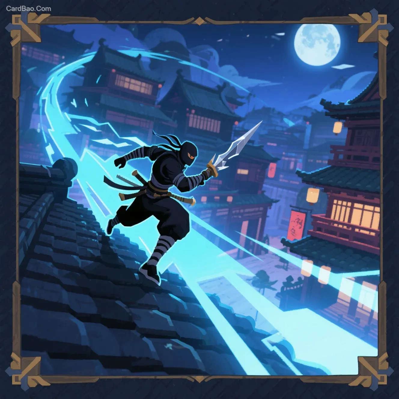 2.5D side-scrolling perspective, a black-clad assassin sprinting across rooftops, shuriken trajectory light effects, Edo-style fortress, cool blue moonlight, speed line effects, game UI border