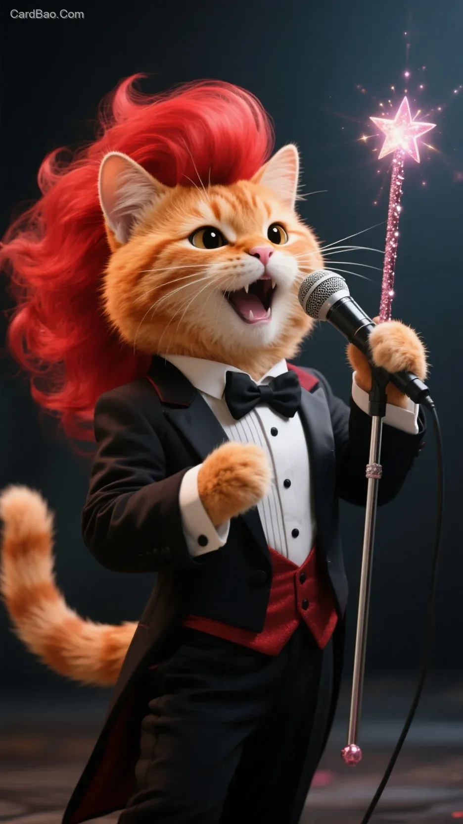 一只拟人化的橘猫模仿歌手唱歌,身穿燕尾服,头发染的大红色造型,手持魔法棒。