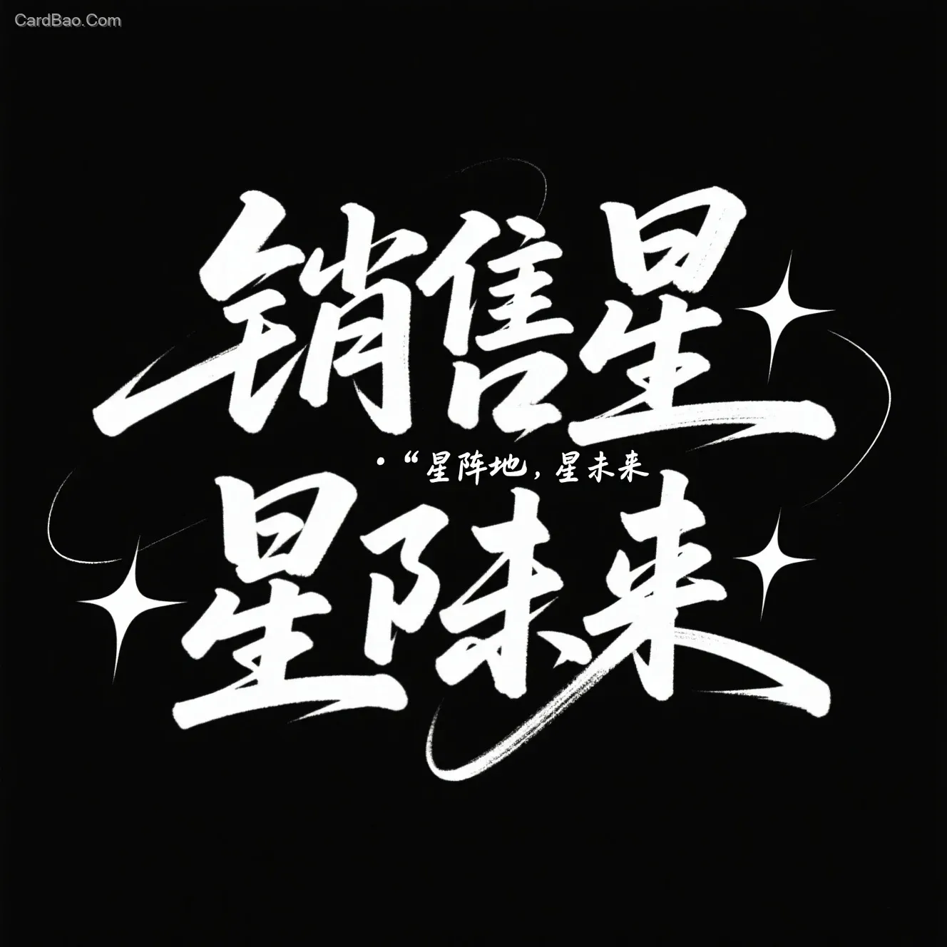 一幅黑白极简风格书法作品,用白色 秀丽笔 手写“销售星”,副标题“星阵地,星未来”笔画粗细对比强烈,起笔粗重收笔细尖,带星星图形点缀,带有飞白效果。文字居中紧凑排列,部分笔画相互穿插,背景纯黑无装饰,高对比突出字体动感。风格兼具现代街头艺术与传统书法韵味,传递自信不羁的态度,8K高清细节