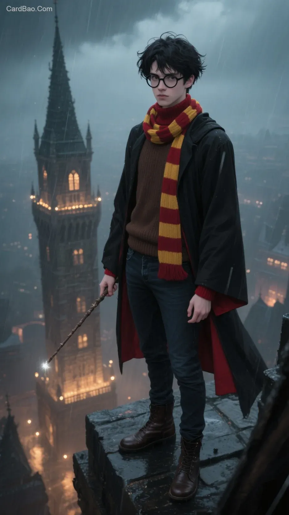 男巫师站在塔楼上,男巫师年龄20岁,黑色短发凌乱,身材高挑瘦削,脸部有棱角但瘦,戴圆框黑色眼镜,直视镜头身体正对镜头表情冷酷,身穿黑色长袍,袍子里边是红色,高领棕色毛衣,戴红黄相间的围巾,深色牛仔裤和皮靴,右手拿着魔杖,宏大构图,视角拉远,光线散射,暴雨,夜晚,极高的塔楼,俯视角,能看见塔楼下边的灯火,人物小一点