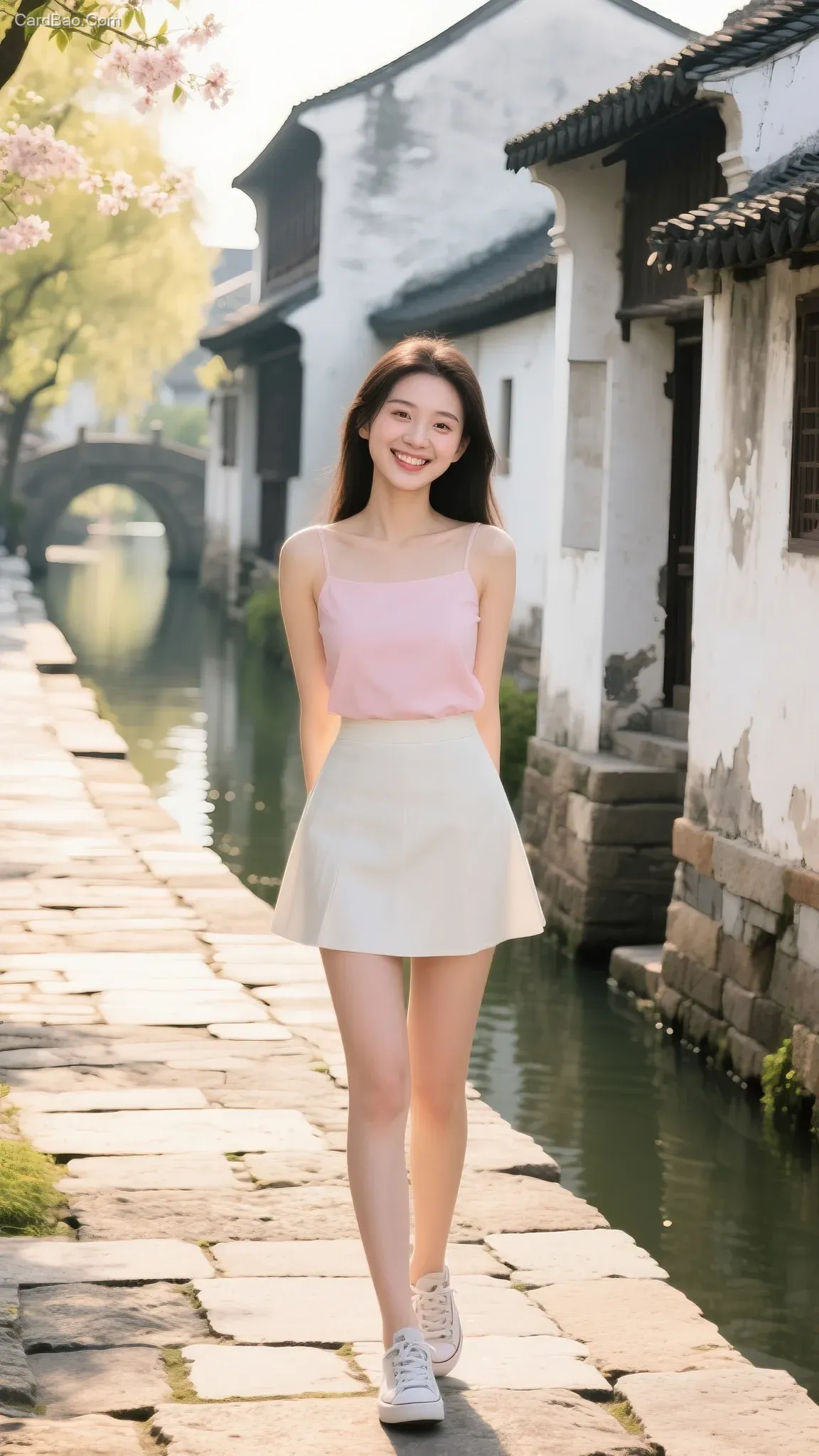 画面聚焦于一位美丽的中国女孩,她站在江南水乡的街道上,全身清晰可见。女孩肤白貌美,宛如春日初绽的花朵般娇艳。脸上化着淡妆,恰到好处地凸显出她精致的五官:柳叶般的眉毛,微微上挑,尽显灵动;双眸明亮有神,仿佛藏着星辰大海;高挺的鼻梁,为面部增添立体感;粉嫩的嘴唇,微微上扬,面含微笑,那笑容如阳光般灿烂,洋溢着满满的青春气息。