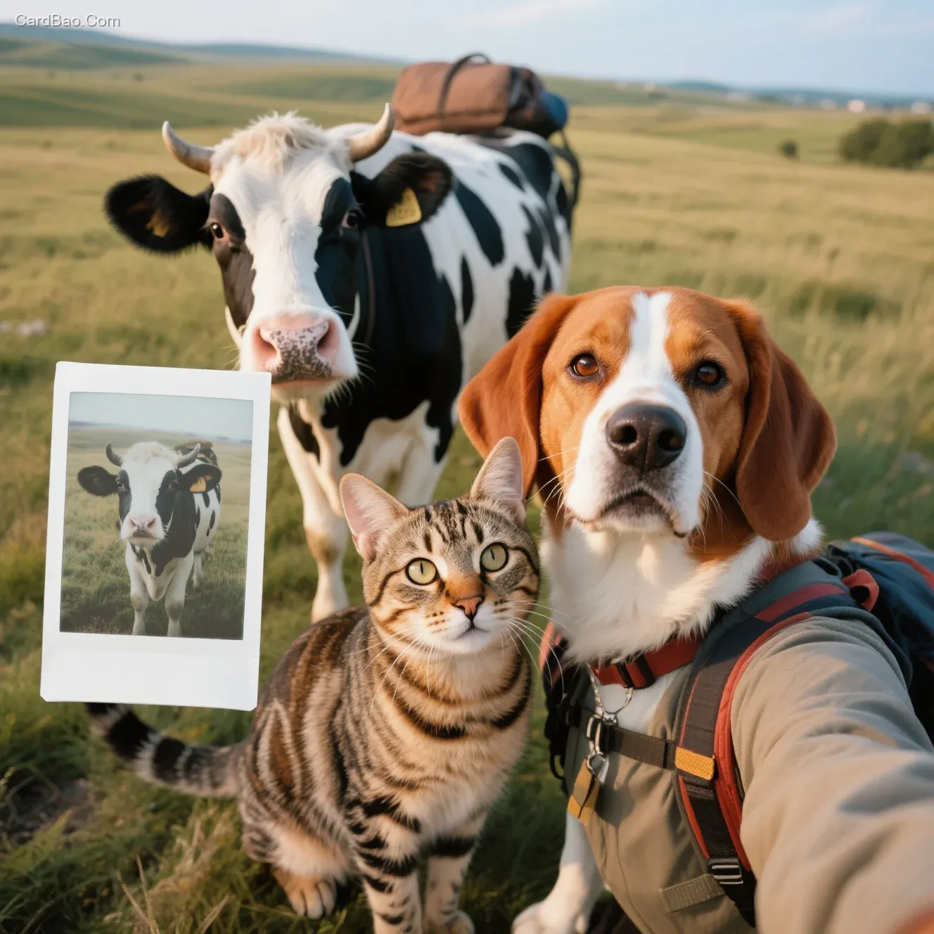 A tabby cat, a five-red dog, and a cow take a travel selfie, AI-style removed, looking down at the camera, close-up shot, Polaroid texture, high contrast. Background is a vast grassland.