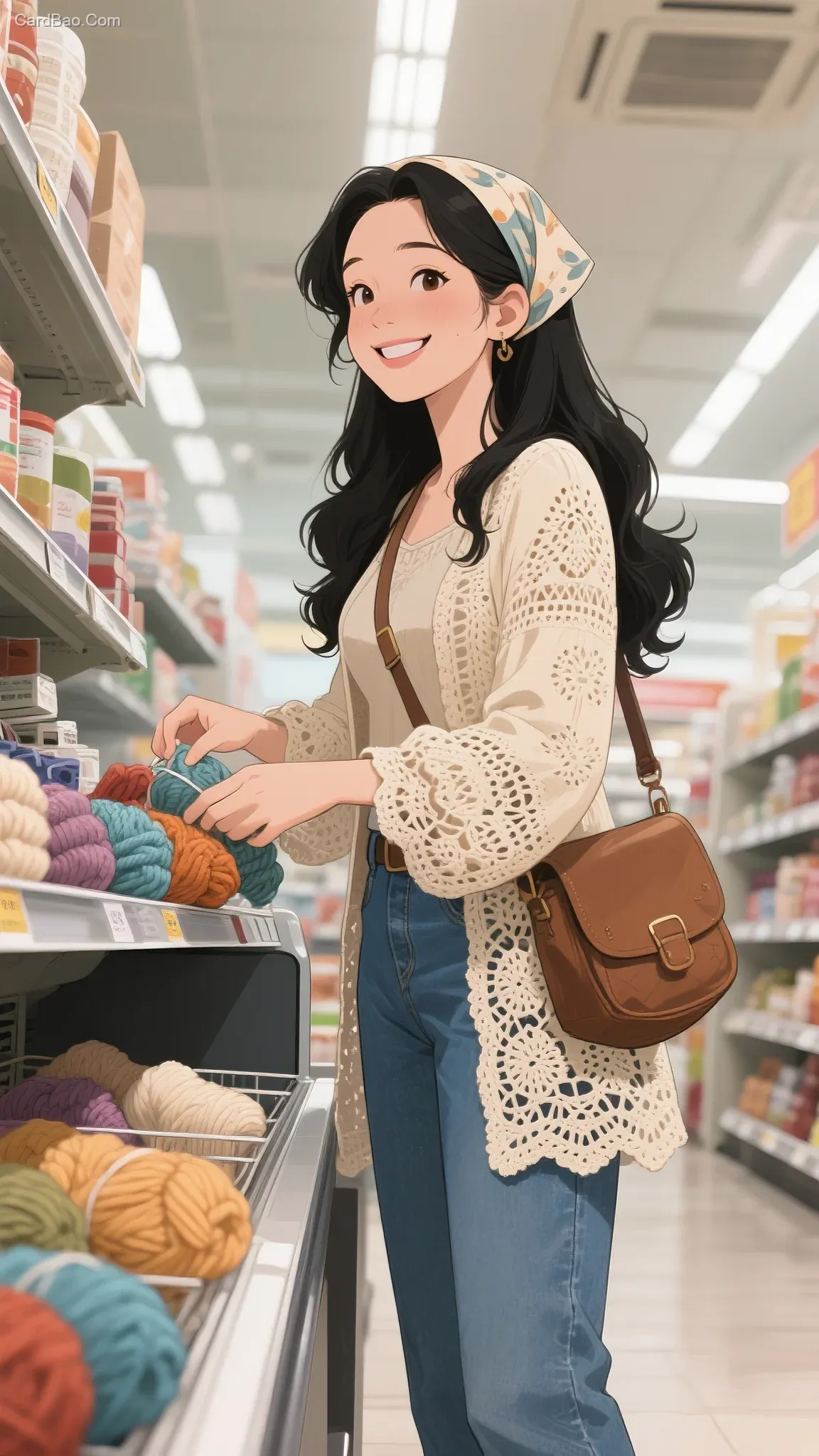 Generate an illustration in the Chinese anime (Guoman) art style, depicting a 35-year-old woman standing at a counter buying yarn. The mood should be relaxed, comfortable, and smiling.