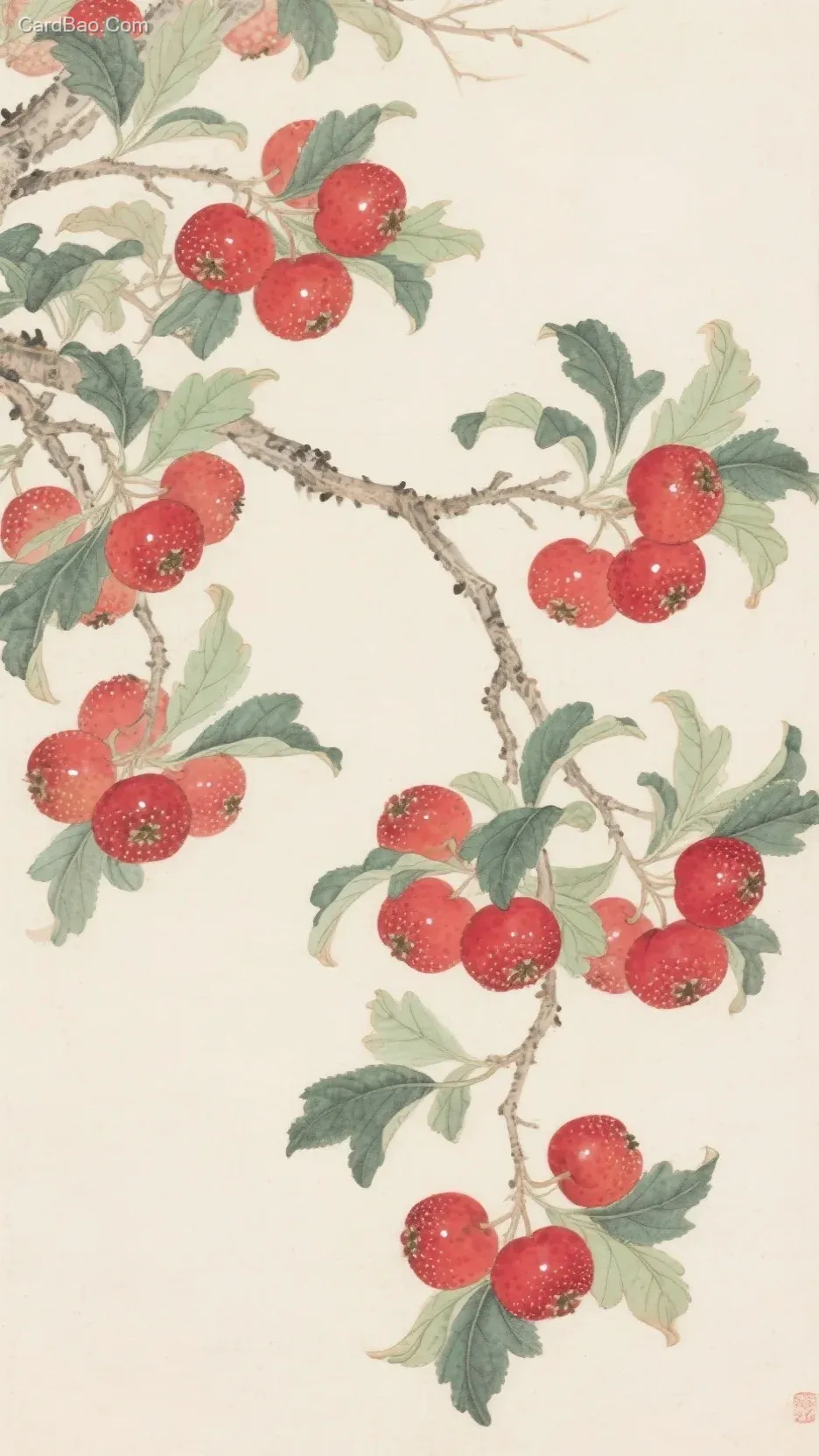 工笔,宋徽宗风格。满枝条的红山楂,晶莹剔透,娇艳欲滴,绿色叶子,诱人的色彩,极简。
