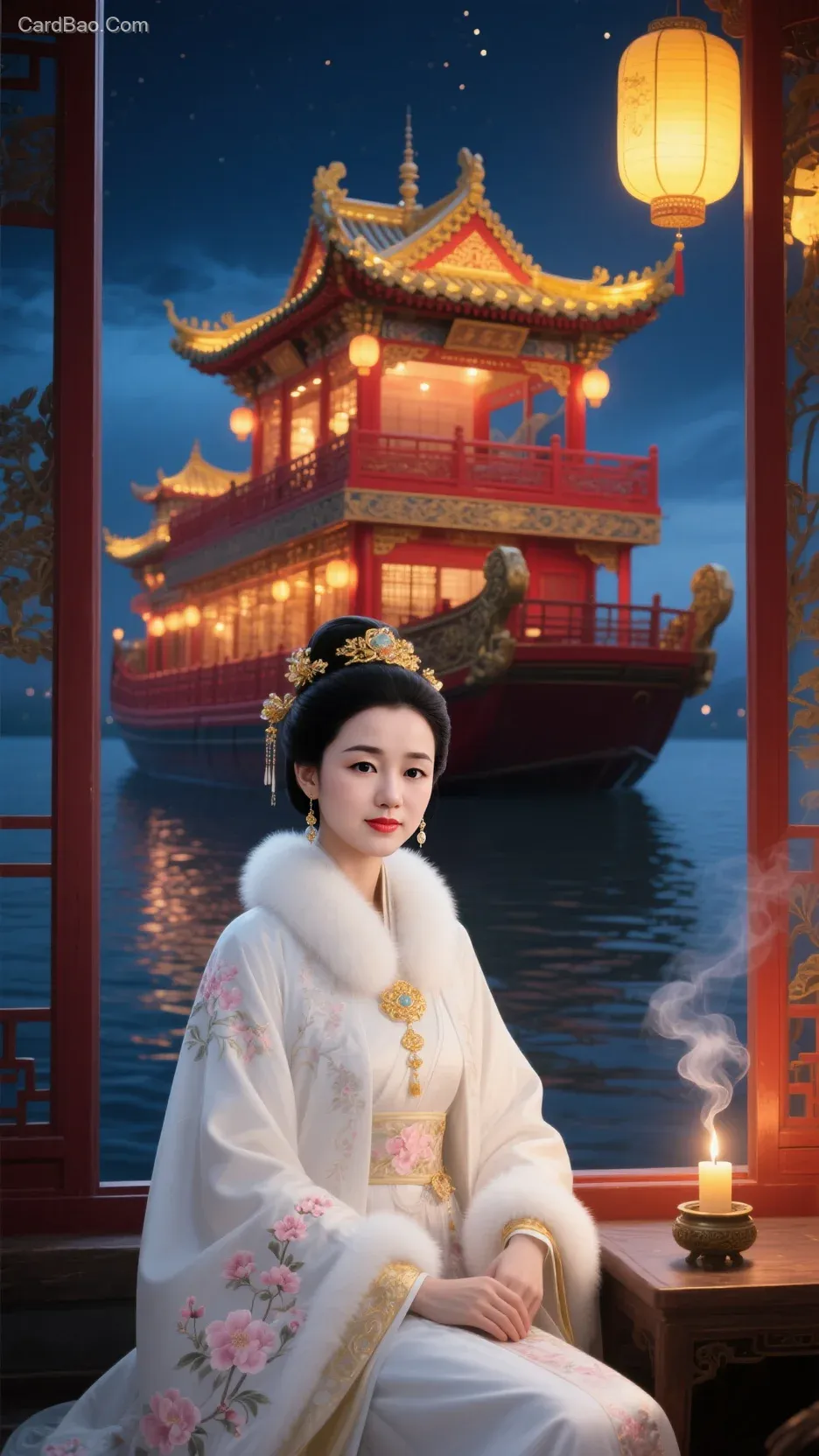 船舱内,一位贵妃静坐窗前。偏瘦的瓜子脸,皮肤光滑,通透,细腻,质感,白净,光滑。她身着月白色锦袍,绣着淡粉海棠花,领口袖口镶着雪白狐毛,更衬肌肤赛雪。如云乌发梳成高髻,斜插着金镶玉步摇,流苏轻颤。她面容绝美,柳叶眉微蹙,明亮的眼神光,楚楚动人,看镜头浅笑。桌上烛火摇曳,映着她的侧影,淡淡烟雾的香炉,画面风格凄美且古典。贵妃身上和脸部以及头顶上有强高光,发丝光和轮廓光。贵妃皮肤白净光滑,肌肤色温为4500K, 突出画面中的人物。高反差,强曝光。oc渲染,cg绘图,xxcoloured渲染。超现实真人写真风格。正面,看镜头微笑。