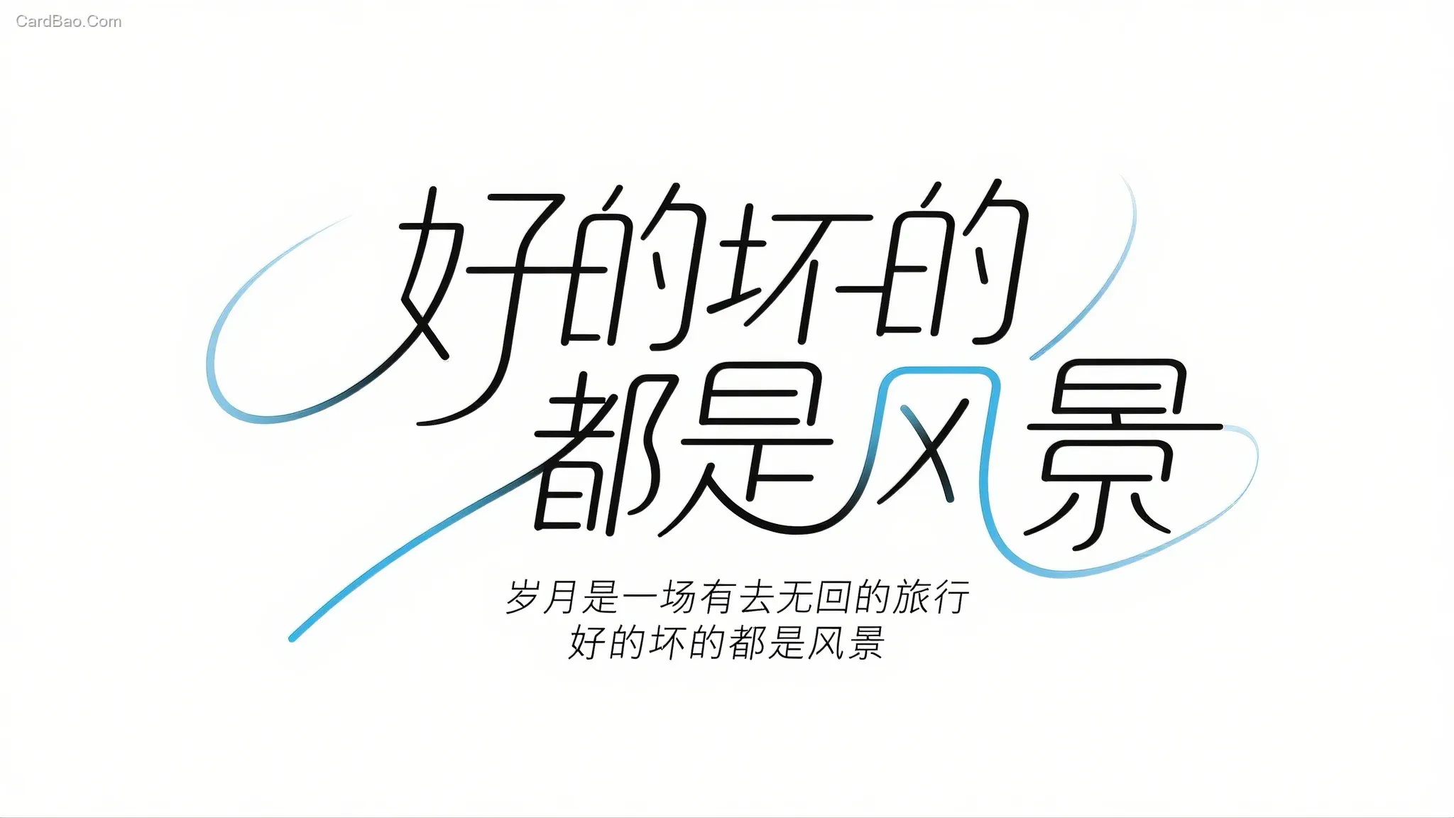White background, creative typography design with smooth and artistic lines, featuring the Chinese text "岁月是一场有去无回的旅行 好的坏的都是风景" (Time is a one-way journey; both the good and bad are part of the scenery). The lines should appear effortless and free-flowing, exuding a sense of sophistication, flat design aesthetic, and the refined touch of a master's work.