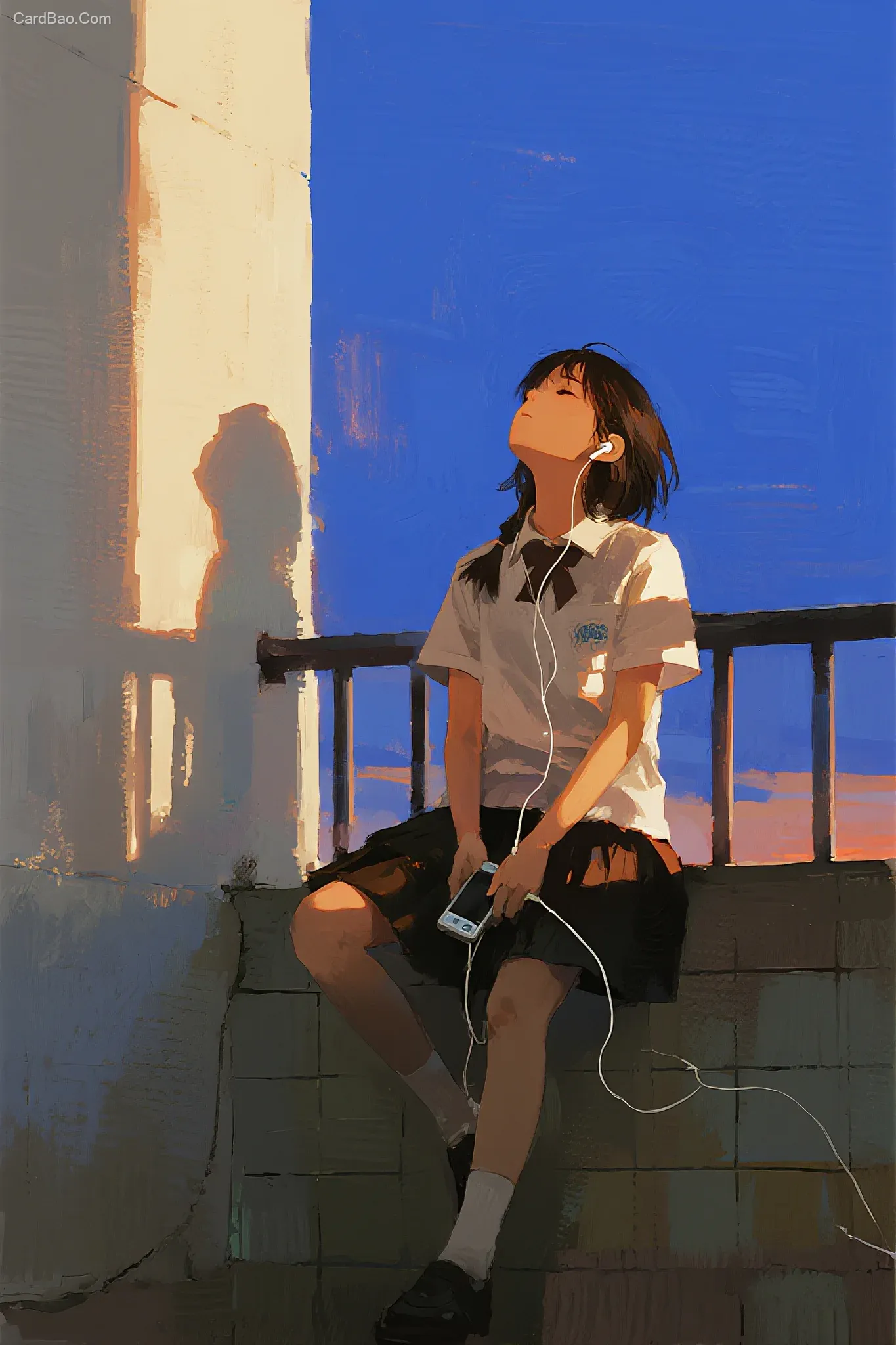 Blue background, sunset glow, color blending, delicate brushstrokes, ink wash rendering, school balcony, a girl sitting alone in the corner, listening to music with wired earbuds connected to an MP3 player, seemingly asleep.