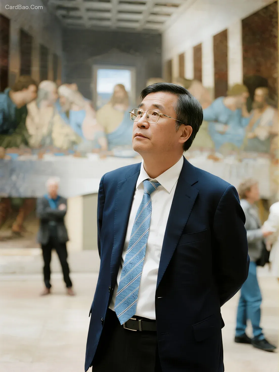真人摄影新闻照片风格,带有胶片质感,运用抓拍手法呈现画面。画面主体是一名40岁的中国男游客,他戴着一副金属边框眼镜,脸上有稀疏的胡茬,身着一件深蓝色的休闲西装外套,外套款式简约,有两个斜插口袋,里面搭配着一件白色纯棉衬衫,领口系着一条浅蓝色细领带,领带的图案是细腻的条纹。下身穿着黑色的西裤,裤线笔直,搭配一双黑色皮鞋。这名男游客正全神贯注、痴迷地欣赏着达芬奇的湿壁画《最后的晚餐》。采用长焦大光圈,将他身边其他游客虚化模糊掉,以此突出主体。