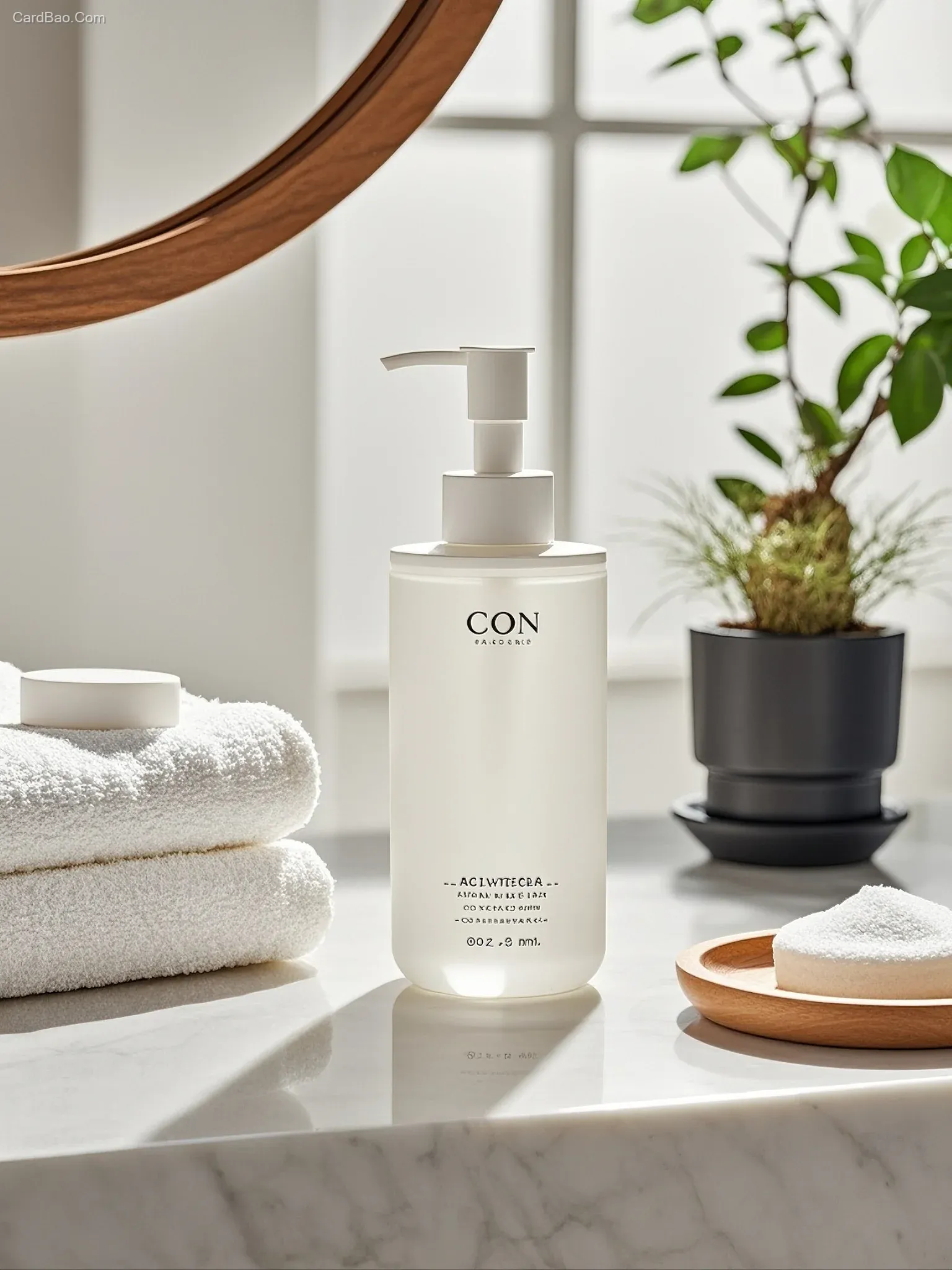 这幅图展示了一个白色的泵动式透明液体护肤产品。这个瓶子有一个白色的标签,上面有黑色的文字。品牌名称是“Con”。瓶子被放在白色大理石浴室柜台上。旁边是白色毛巾整齐地放在一个圆形木托盘上。在背景中,有一面木制框架的圆形镜子反射窗外的光线,黑色容器中有一盆绿色植物,营造出简单清新的氛围。极简风格,产品摄影,产品渲染,超写实,明亮简洁,光影结合