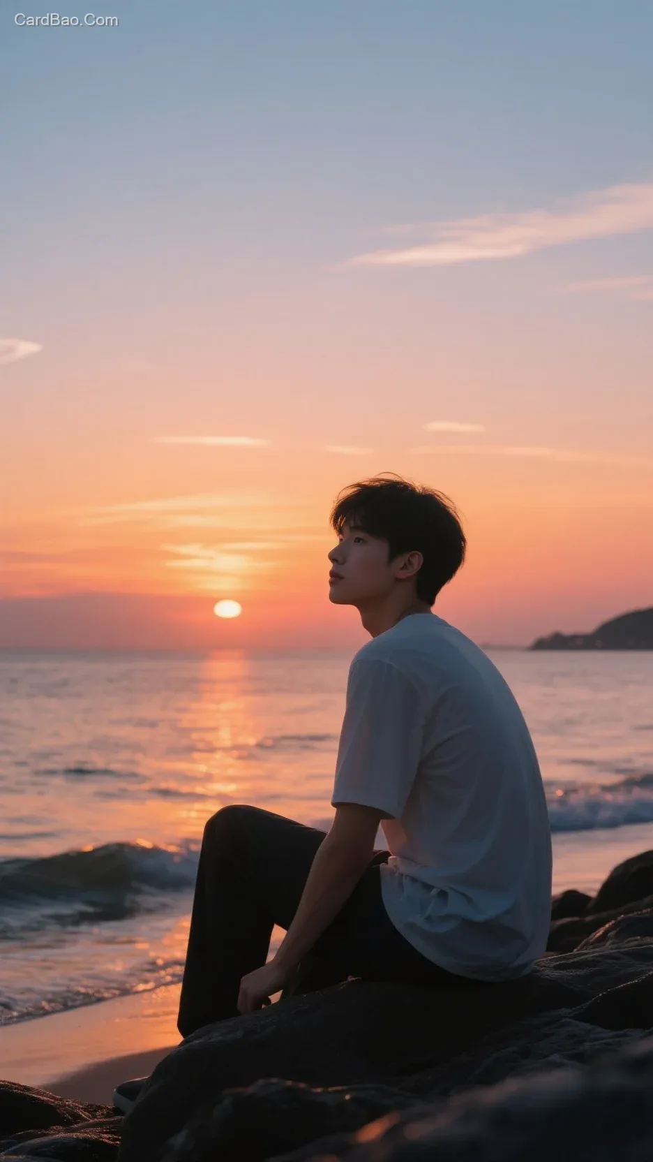 A melancholic yet handsome young man with a boyish charm, sitting by the seaside admiring the beautiful sunset scenery.