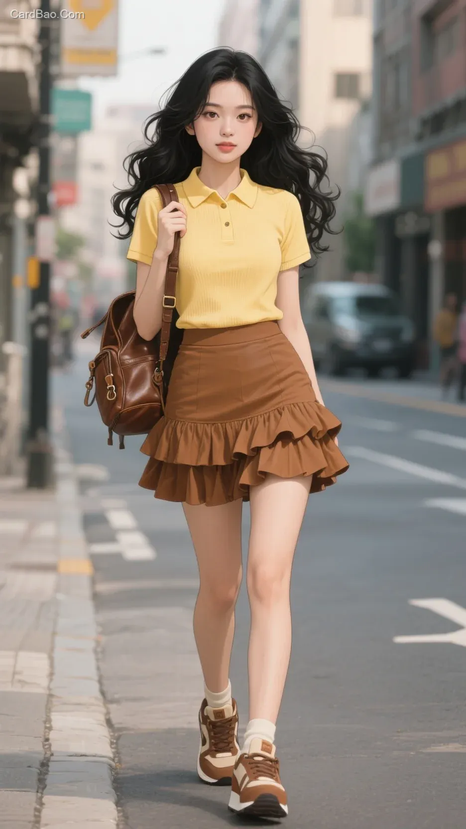 动漫风格,线条细腻流畅,色彩柔和,营造出专业且温馨的氛围,港风,柔和,整体氛围轻松愉快且温馨,知性优雅,面庞白皙精致,高挺鼻梁,漂亮,凹凸有致,黑色波浪长卷发,25 岁,白皙,气质,清纯五官精致肤白貌美。中景,在街道,下班的路上。她穿着上衣:奶油黄短款Polo领短袖(比原图稍深色调,面料选珠地棉)