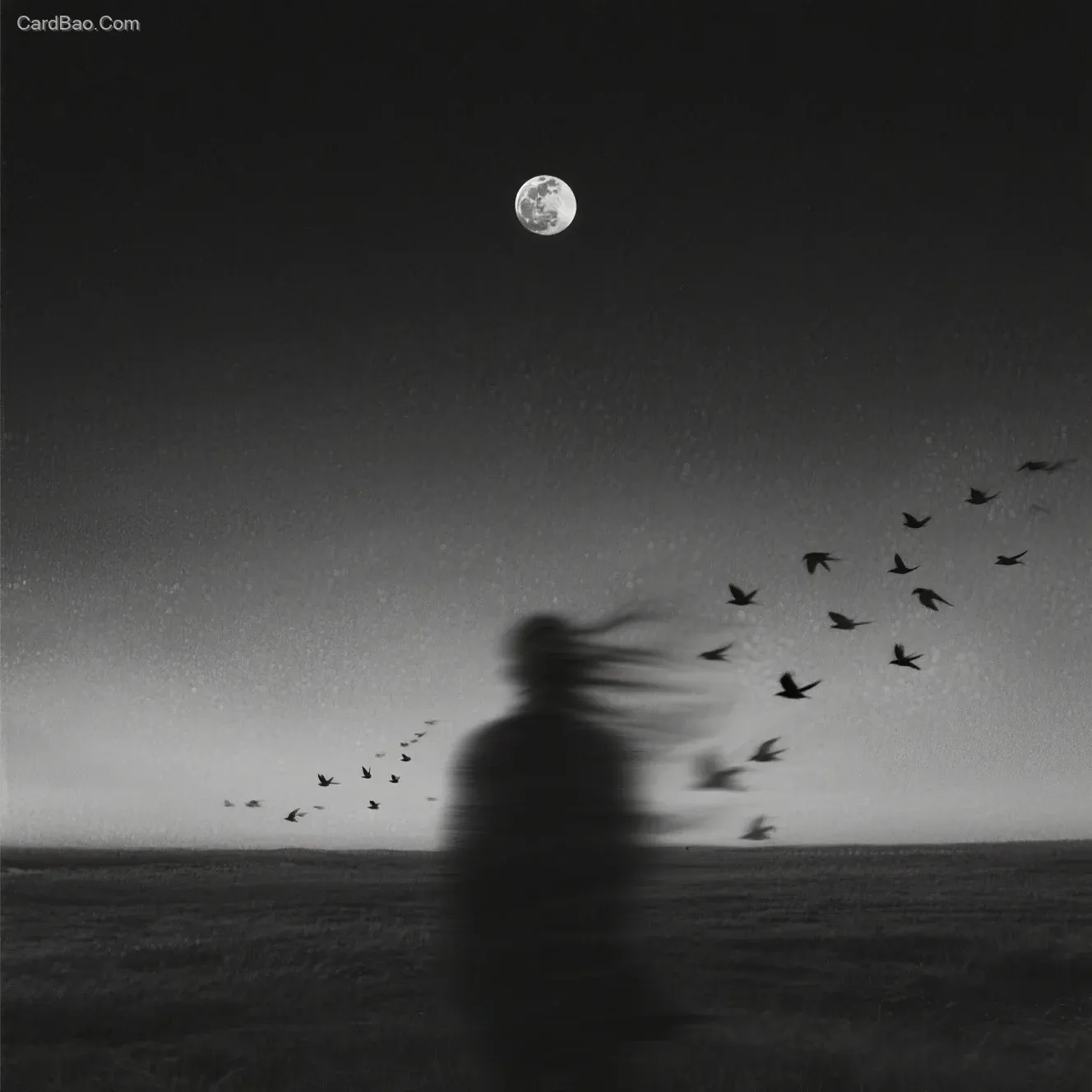 孤独弯月,旷野地平线孤独的背影,背影在风中消散成微小的鸟群,随风飘散,抽象的黑白影像,昏暗微光。