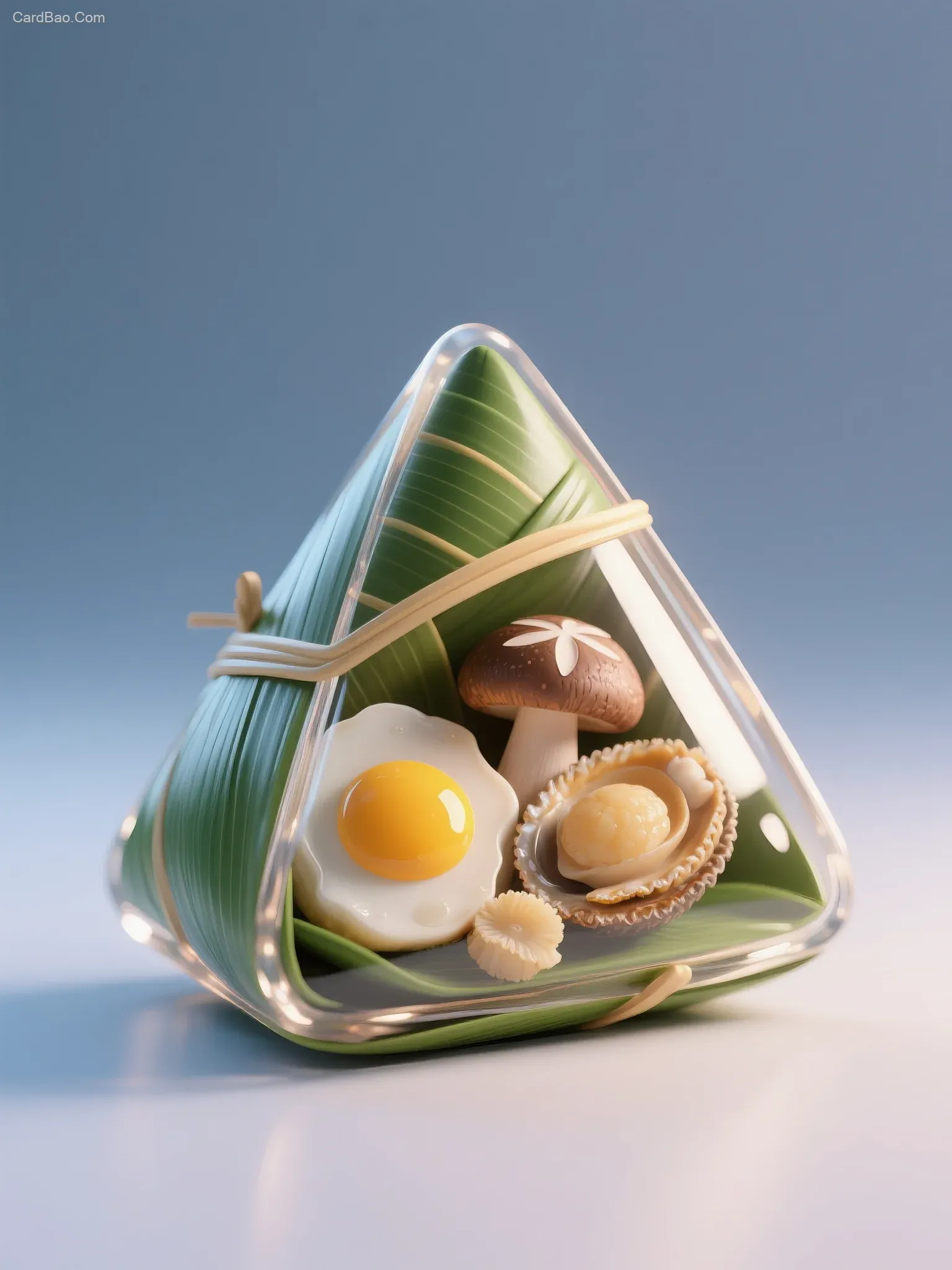A creative miniature scene in the shape of a zongzi (sticky rice dumpling), featuring a transparent outer layer to showcase the interior. The filling should include egg yolk, mushrooms, abalone, and dried scallops, all neatly contained within the zongzi without overflowing. The background should be a clean, solid color. The overall style should be a 3D render with a dreamy aesthetic, created using 3D modeling software like Blender or Cinema 4D. Pay attention to glossy material settings, soft lighting to create a gentle atmosphere, and ultra-detailed, high-definition quality. Incorporate HDR, cinematic composition, and emphasize dreamlike aesthetics. Realistic textures and lighting should enhance the authenticity of the food.