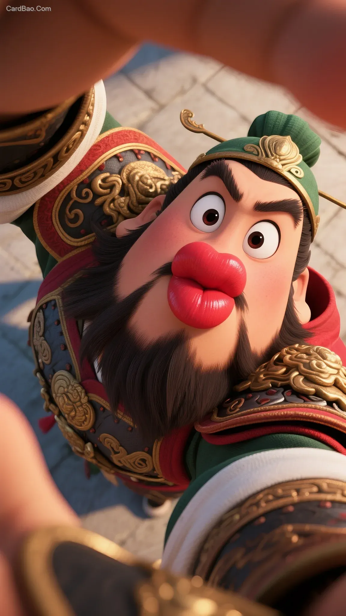 Guan Yu, pouting lips, thick bright red lips, vibrant lipstick, playful and cute, Pixar animation style, fisheye lens effect, close-up selfie, macro shot, overhead angle, exaggerated perspective, humorous atmosphere.