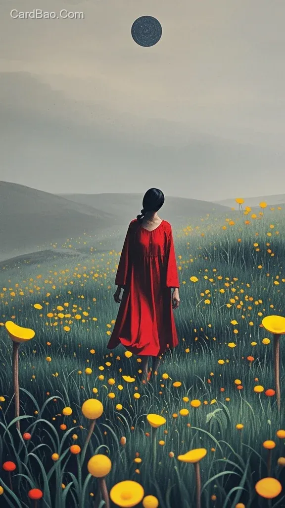 Surrealist illustration, eerie atmosphere, vintage, rough grain, holographic photo printing, low saturation, dark tones, freehand brushwork, abstract, conceptual, illusory, dreamlike and fantastical. A tiny figure of a woman in red disappears into the vast wilderness, with yellow wildflowers, green grass, diffusion, ethereal, mysterious, sense of nothingness, spatial depth, Monet, Yayoi Kusama, Picasso, minimalism, negative space, artistic conception, sophisticated, masterpiece.
