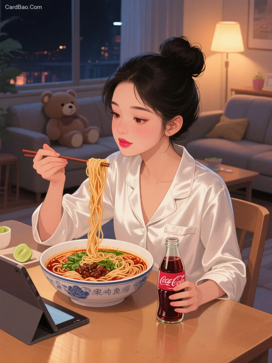 - AI 绘画提示:绘制一幅数字插画,夜晚,整体氛围温馨日常且满含期许,漂亮,一头乌黑慵懒蓬松的丸子头(适配画面女生发型呈现 ),24 岁(可按需调整 ),白皙,气质,稳重大方,芭乐色口红,真实,高清,数字插画。画面呈现居家全景,以侧方角度,展现女孩身着奶白色缎面睡衣在餐桌前用餐,一手夹面一手拿可乐,女孩面前有一大碗重庆小面,桌上美食、平板,背景客厅沙发、小熊、柔和灯光清晰呈现,凸显温馨日常氛围 。