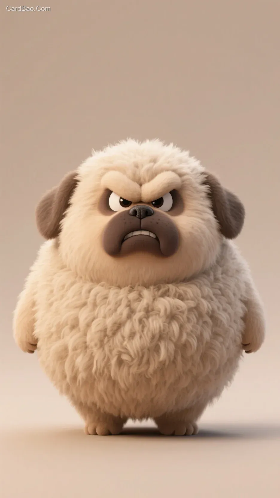 毛茸茸,一只胖乎乎的球形身材的愤怒表情的狗,毛绒绒的蓬松质感,3D,C4D渲染,纯色简约背景,极致的清晰度,