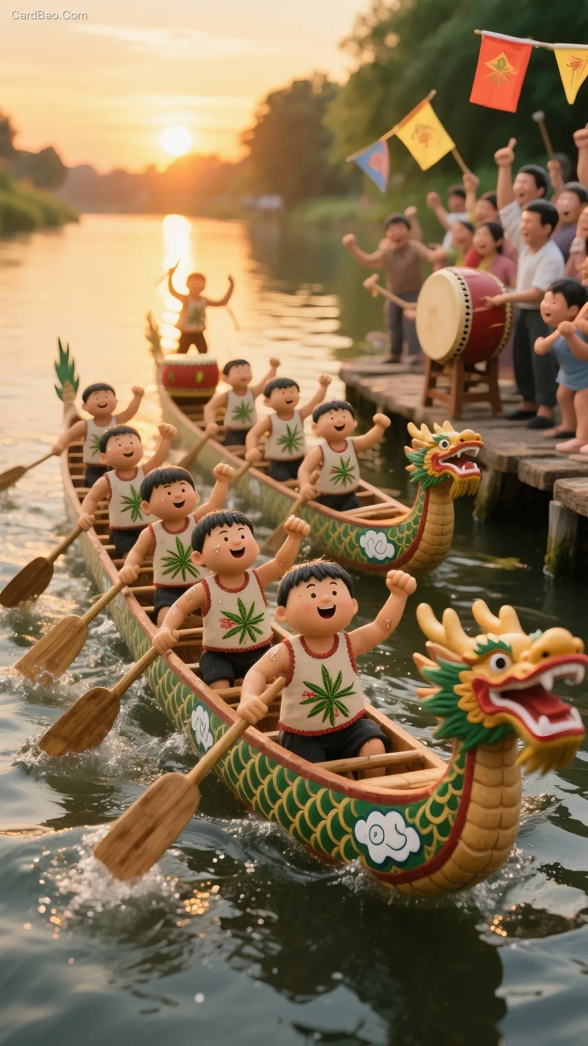 微型小人国的小人们,夕阳给河面镀上一层金辉,微型龙舟赛正式开始。八艘用葫芦壳雕刻的龙舟停靠在岸边,船身彩绘着着六位微型小人划手,他们穿着绣着艾草图案的背心,握着芦苇杆削成的船桨。随着鼓声响起,鳞片与云纹,船头立着威风凛凛的龙头。每艘龙舟上坐龙舟如离弦之箭冲出去,船桨划破水面,溅起细碎的水花。岸边观众挥舞着自制的小彩旗,呐喊声此起彼伏。最先冲过终点的龙舟队高举船桨欢呼,队员们额头沁着汗珠,脸上却洋溢着自豪的笑容,为这场端午盛会画上圆满句号。