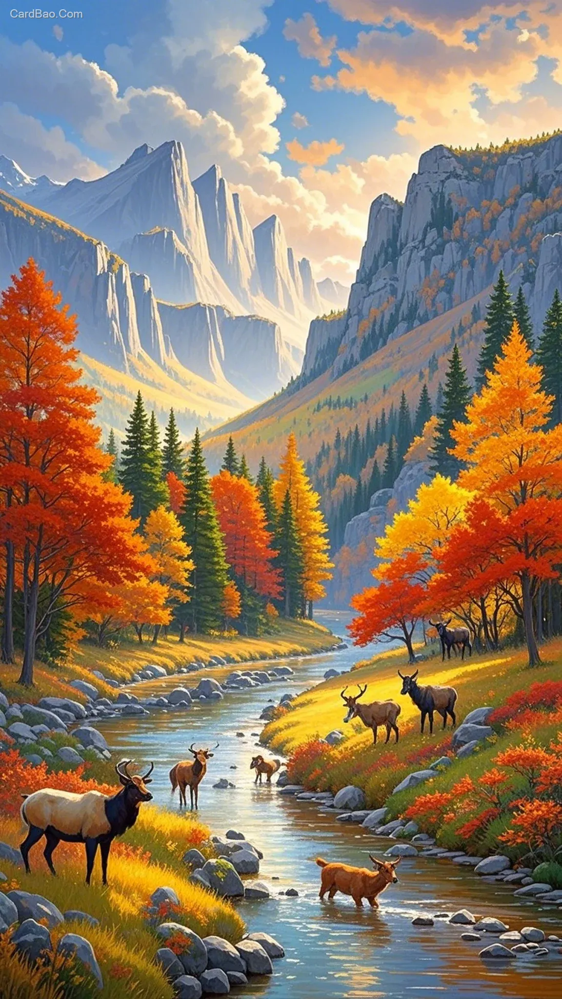 Golden autumn valley, mountains, forests, rivers, cliffs, red and yellow leaves. Diverse biomes. Highly detailed, realistic textures, clouds and atmosphere. Autumncore, layered painting with vivid colors.