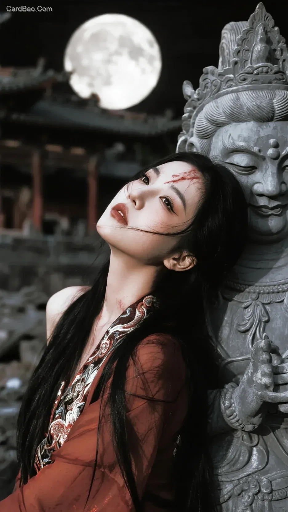 长发及腰,旷世美女,华美服饰,全身特写,胶片摄影,对焦模糊,灰色强侧光、伦勃朗光,碎发丝飘起,神态颓废、慵懒,肌理质感,聊斋风格,怪诞,阴森,恐怖。破败的寺庙,月色,阴森的怒目金刚雕塑。