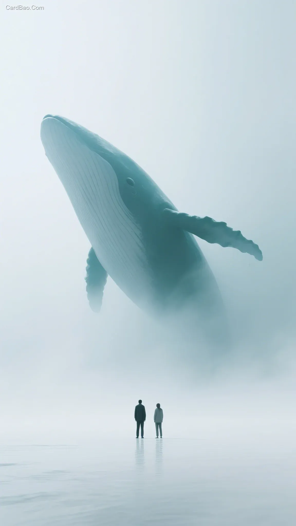 This image presents a minimalist surrealist style. A white void is permeated with dense fog, with tones of blue-green and light gray interwoven. The composition features a massive whale figure that delivers a strong visual impact, creating a mysterious atmosphere. Two human figures stand in the foreground, adding narrative depth and contrast to the scene, as if engaging in a silent gaze with the colossal whale, embodying the essence of metaphorical art. Enhanced by 3D effects, the overall image exhibits rich dimensionality and achieves high-definition clarity.