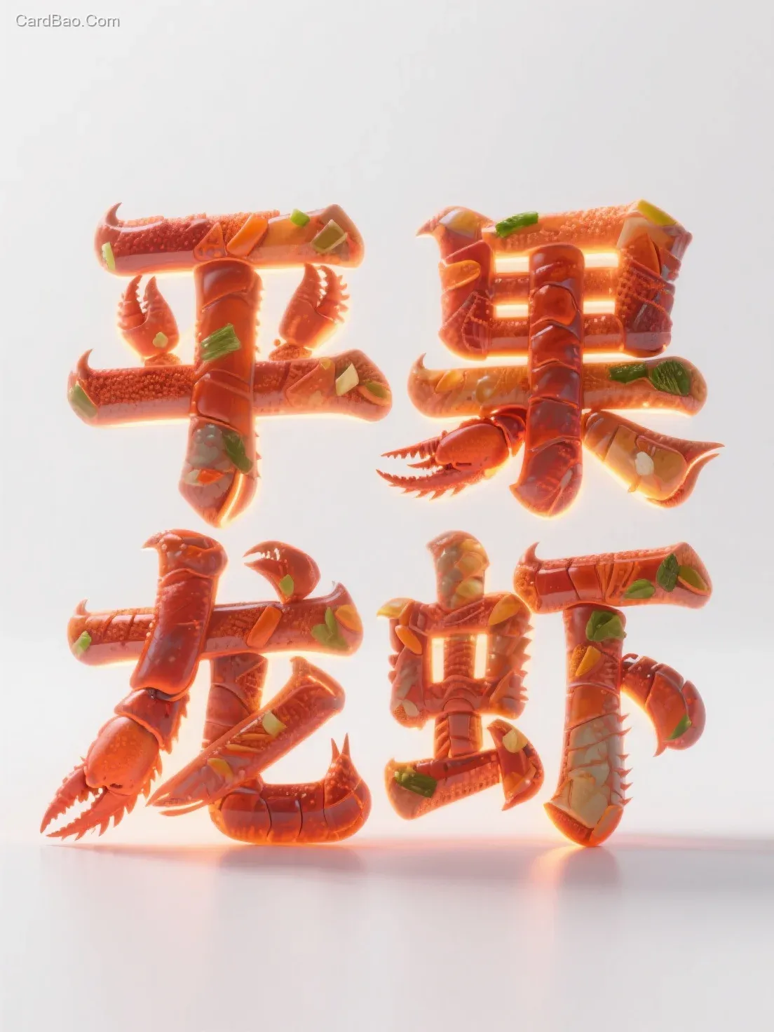 Creative Artistic Typography Design: The characters "Ping Guo Long Xia" (Apple Lobster) are crafted using lobster-like material, with a subtle texture of seasoning ingredients on the surface. Set against a solid-color background, the ultra-HD 8K resolution highlights the intricate sense of three-dimensional structure. Achieve high-detail and depth-of-field effects using Cinema 4D and Octane Renderer.