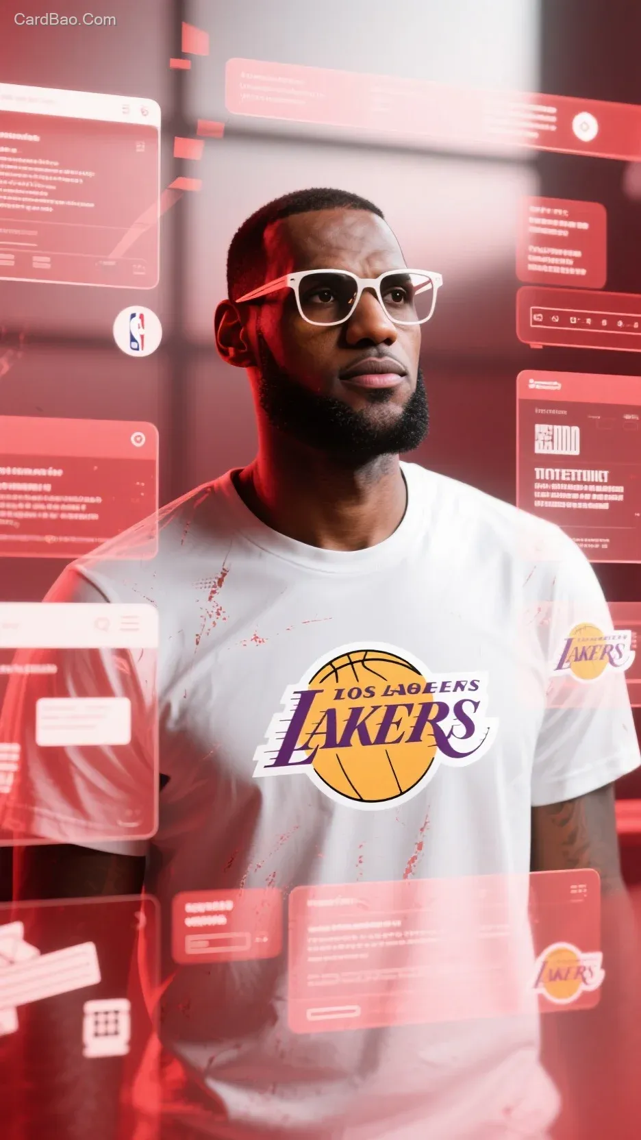 光朦,穿着湖人logo短袖戴眼镜的勒布朗詹姆斯用眼镜投影AR,多界面分布,漂浮的界面环绕人物周围,浅景深,朦胧渐变,模糊虚化,梦核,动态模糊影像,背景是多重分屏排版的朦胧光影面,白色氛围,红色,迷幻,刮痕,质感,肌理,弥散渐变,层次感,梦幻,漏光,高噪点,强烈的老胶片颗粒,梦核,空灵,如梦似幻,超现实主义,杰作,贴纸+英文信息解析点缀