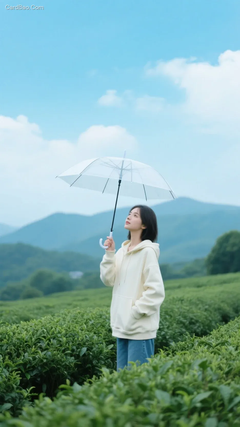 一位女子站在一片翠绿的茶园中,她手持一把透明雨伞,身穿米白色连帽外套和蓝色牛仔裤。背景是蓝天白云,远处山峦若隐若现,营造出清新、自然、宁静的户外氛围,仿佛是一场惬意的田园漫步 。