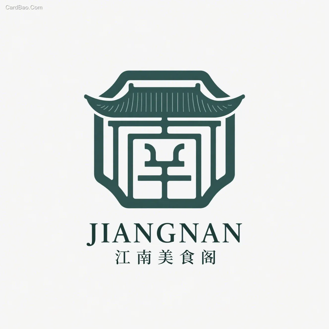 Vector illustration, logo, emblem, white background, Song Dynasty gongbi style, composed of ultra-fine lines, simple composition, Jiangnan theme, showcasing Song Dynasty aesthetics, minimalist approach, primarily dark green color scheme, international appeal, premium feel, flat design style, artistic sensibility, with "JIANGNAN" in small text at the bottom and "江南美食阁" (Jiangnan Gourmet Pavilion) as secondary text.