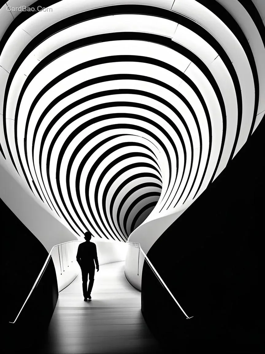 ##8K 高清,黑白摄影,螺旋线条构成的现代建筑通道,高对比度光影交错,一人独行其中,营造神秘孤独氛围,展现建筑精致结构与光滑质感。