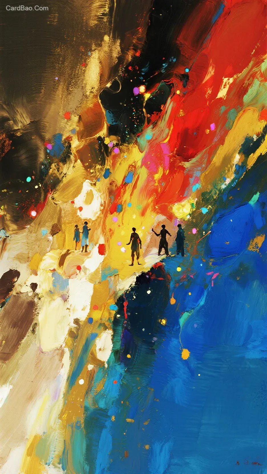 Abstract expressionism, deconstructive art, fluid sandblasting, titanium blue + golden yellow + vermilion gradient blending, dreamy and psychedelic colors, tiny figures celebrating in dance and song, neon flickering, motion blur, minimalism, masterpiece.