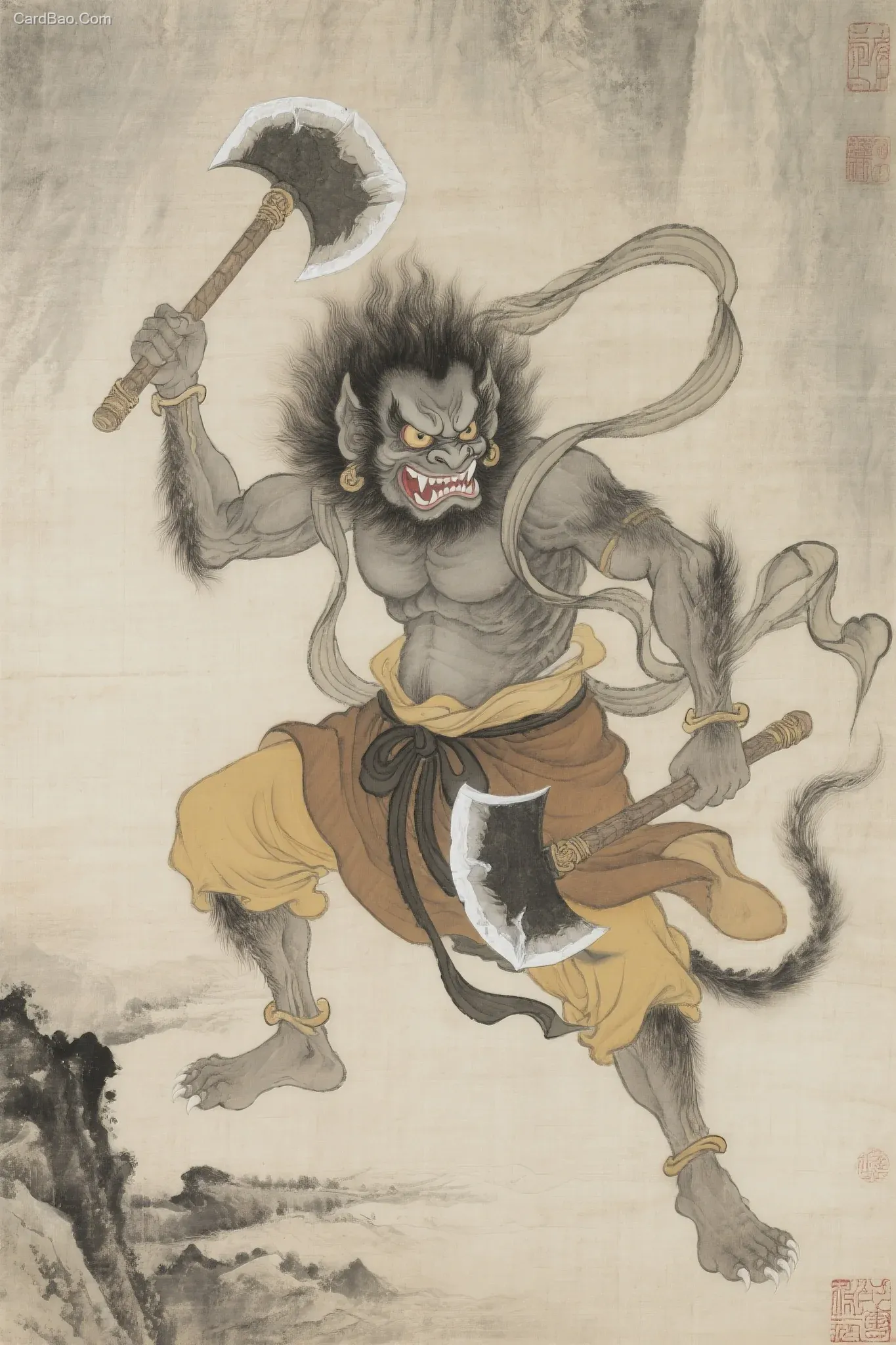 中国神话里的夜叉,其外貌奇特,毛发冲冠、面目狰狞,手持一对斧头,姿态有动感,呈现出威慑力,用传统工笔线条勾勒,线条细腻,能体现出肌肉、毛发等质感;设色古朴,以皮肤的灰、衣物的黄褐为主,有古画的韵味,泛灰的绢布为背景,突出主体,是中国古代神怪画常见的简约背景处理方式,类似《搜山图》《西游记》相关神怪插画的风格脉络 。