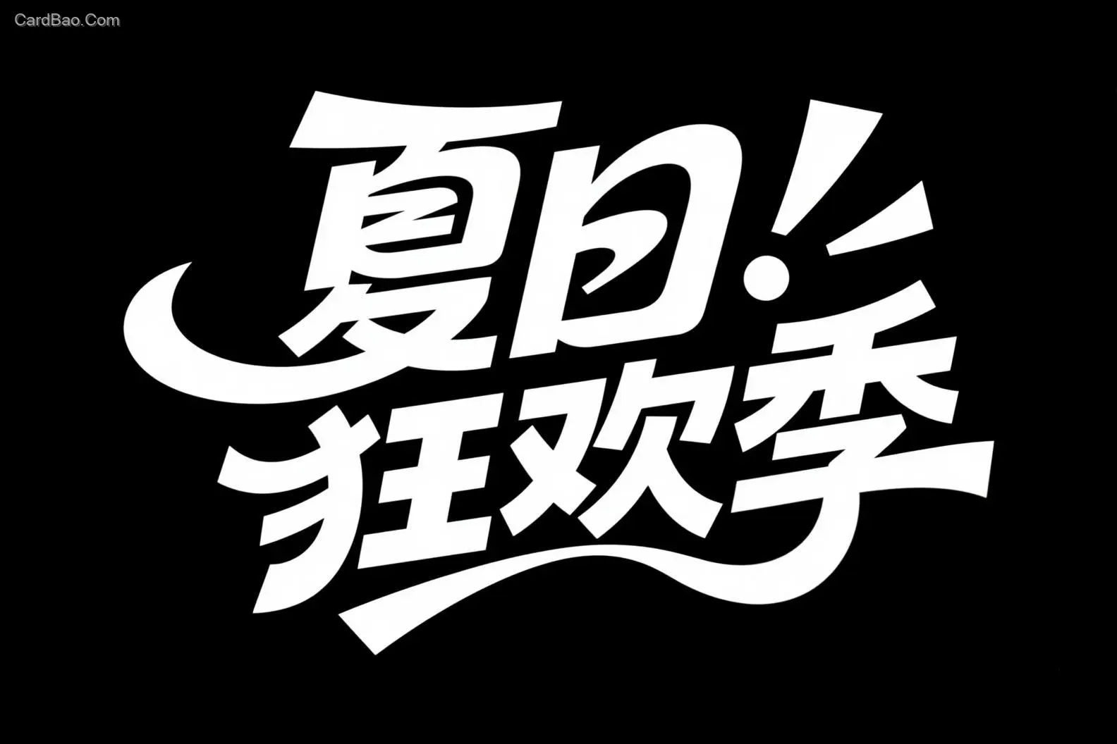 黑色背景,白色字体,字体设计“夏日狂欢季”,扁平,标志,创意字体设计,线条流畅且富有共术感中文,将字体进行抽象变形,创造独特的节奏和动感,给人以强烈的视觉冲击高级感。