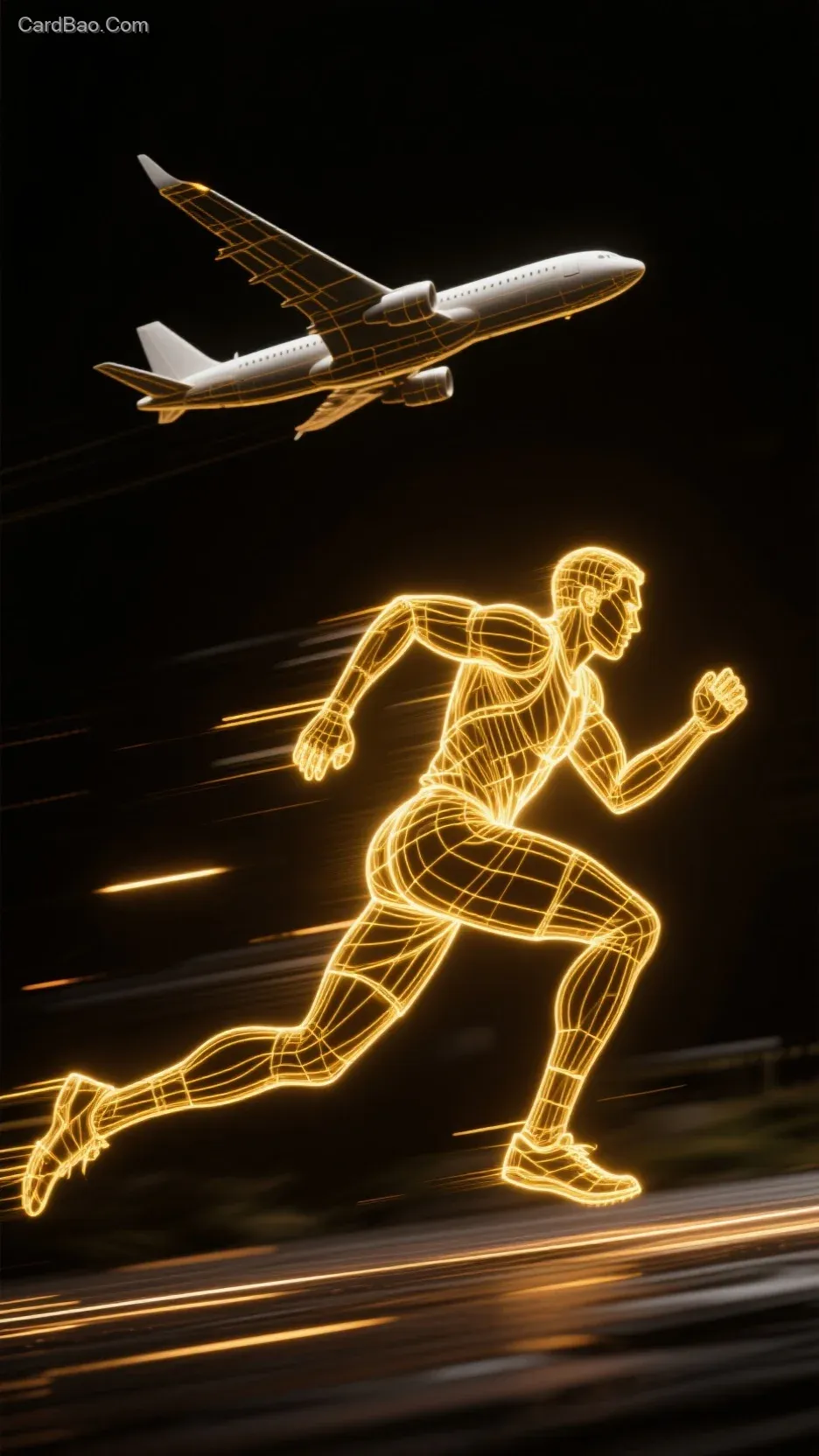 Golden wireframe line art style depicting a long-distance runner in motion, radiating golden energy and light effects against a dark background. Features motion blur for a high-speed photography effect, capturing dynamic athletic poses with cinematic texture, film scene atmosphere, and dramatic lighting. Shot with a wide-angle lens in full-length view, synchronized with an airplane in rhythm.