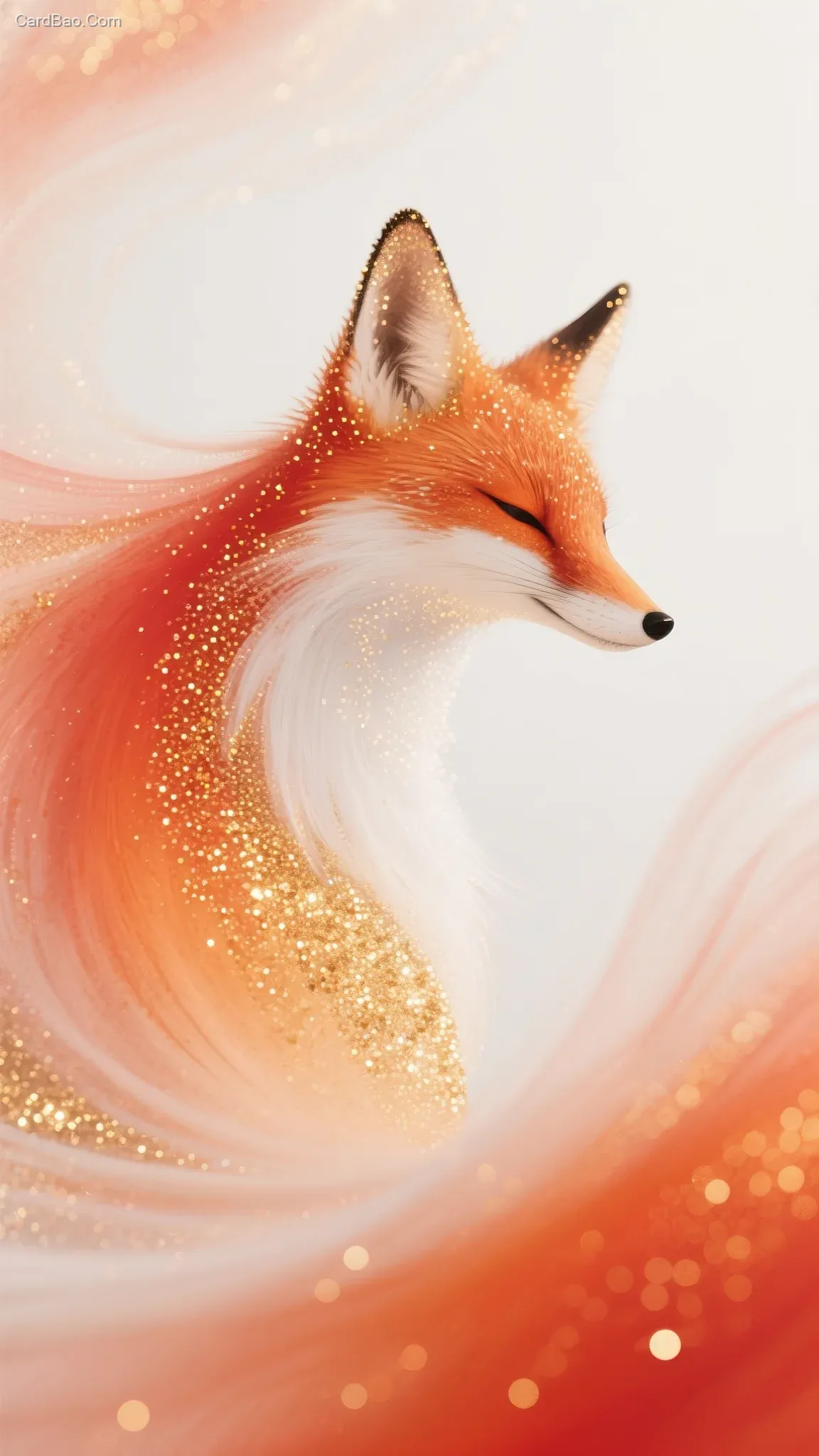 红橙白渐变色金光闪闪的细小颗粒形成一个古典狐妖,高清画质,留白,抽象派,唯美梦幻朦胧美,高级艺术品,大师的杰作