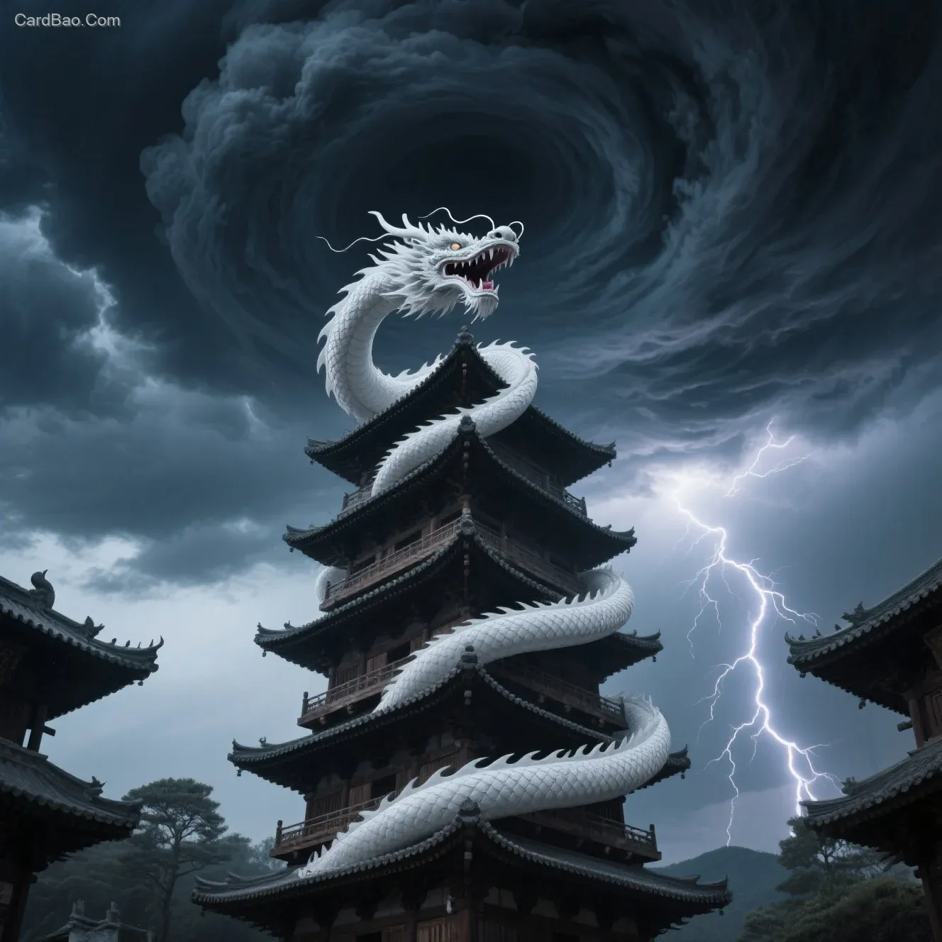 寺庙中,一座七层四面木质塔耸立,塔上方的天空一片乌云,旋涡状,凸显山雨欲来风满楼的感觉,塔身上缠绕着一直白色的龙,威武,龙头在塔顶,张开大口怒吼,远处有闪电