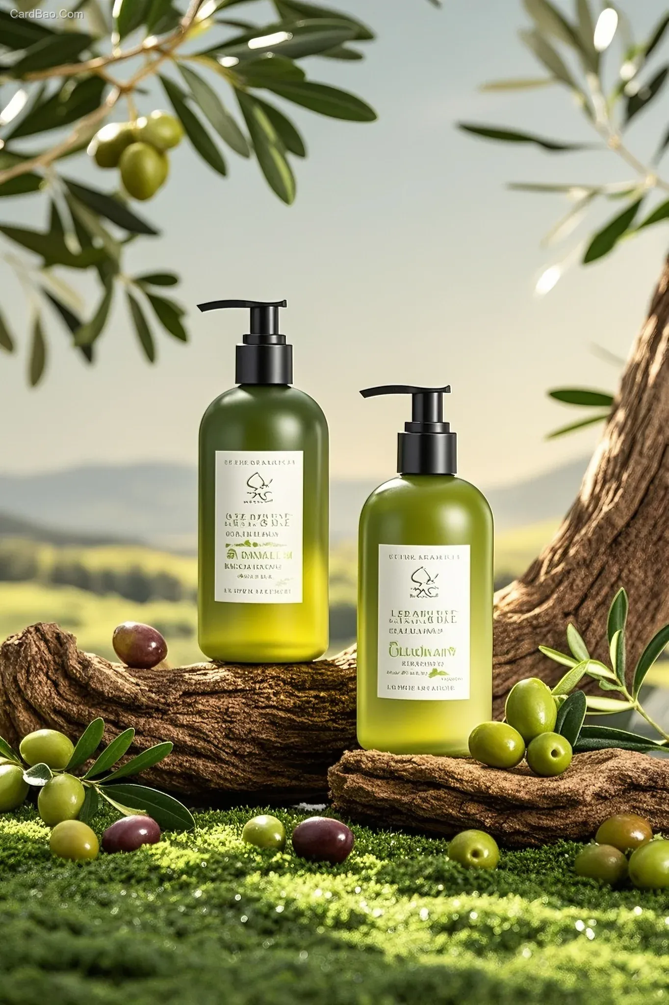 两瓶橄榄油身体乳,玉龙茶香,绿色渐变瓶身,瓶身瘦小,按压泵头设计,温和无刺激配方,敏肌适用,放置于树根上,背景在户外天空浅绿渐变,有阳光,橄榄果点缀,有空间感,电商海报