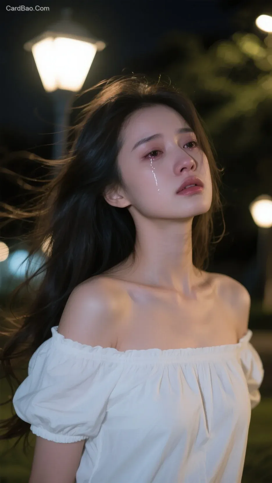户外人像写真,漂亮小姐姐,皮肤白暂光泽,风吹起长发飘逸,半遮朦胧不清的脸,白色香肩上衣,夜晚,路灯,微醺的感觉,流下伤心的眼泪,泪痕实拍,特写,32K超高清画质,超高细节精度