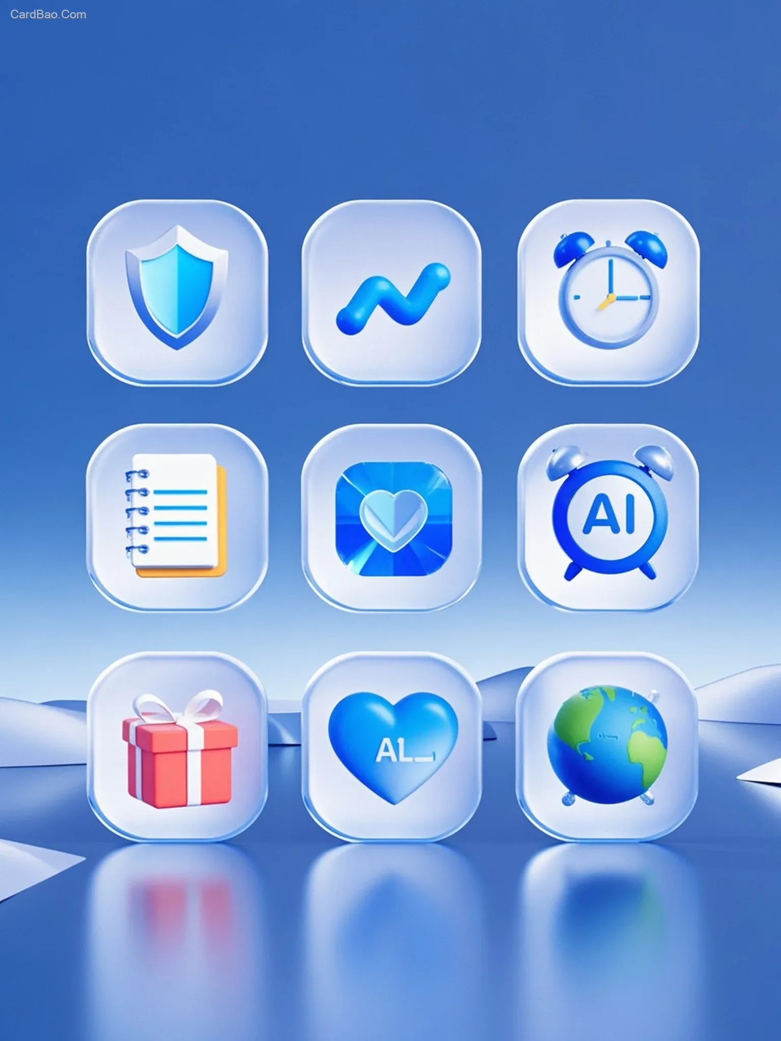 icon图标设计,图标顺序依次是:盾牌,曲线,爱心,礼物,AI,记事本,地球仪,地图,闹钟,立体科技感,水晶半透明,3D,立体感,颜色统一