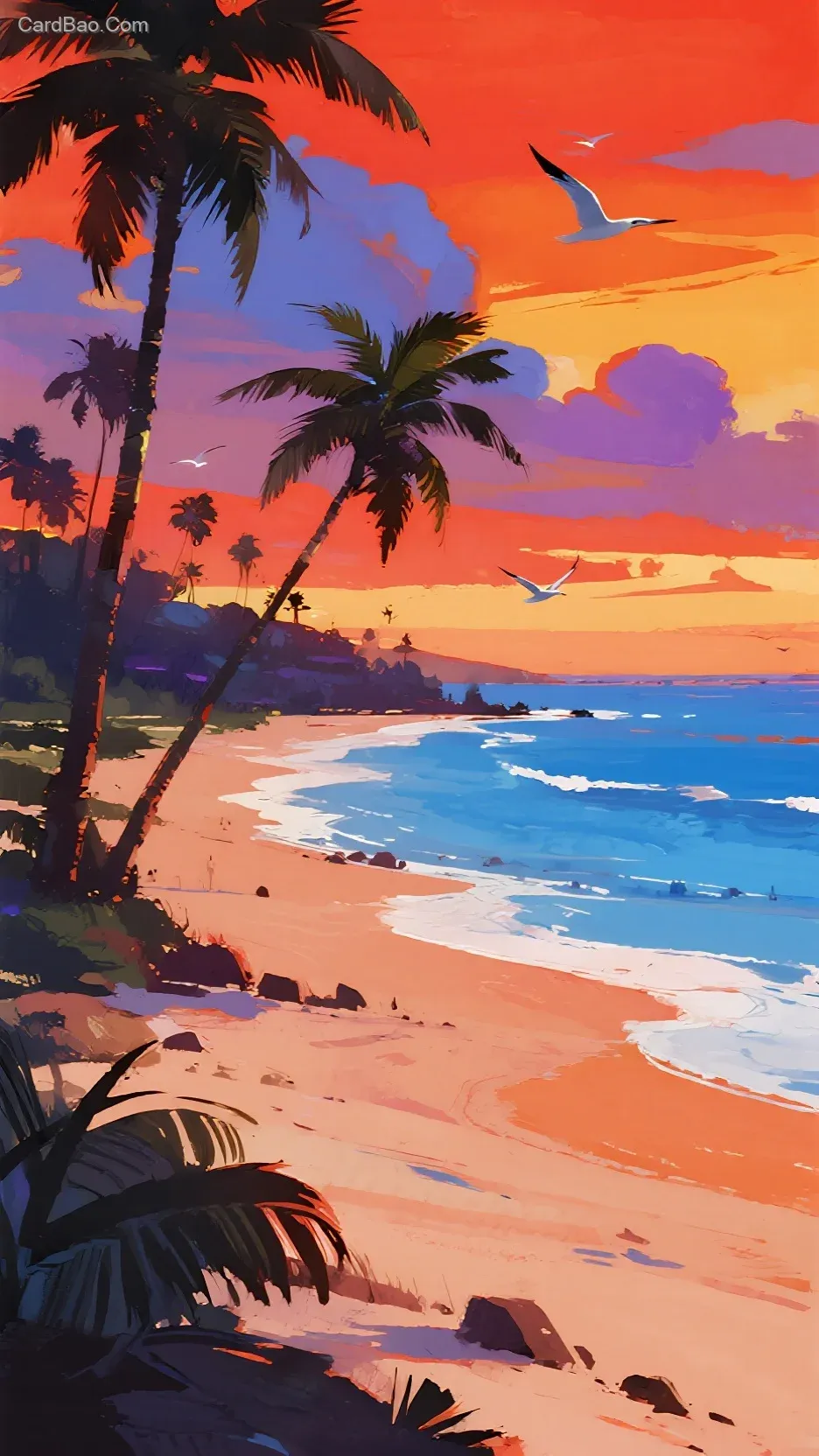 Watercolor hand-painting, sunset glow, seaside, orange-red, blue, and purple tones, rich content, detailed depiction, sandy beach, palm trees, seagulls, sense of movement, near objects large and distant objects small, following perspective principles, delicate.
