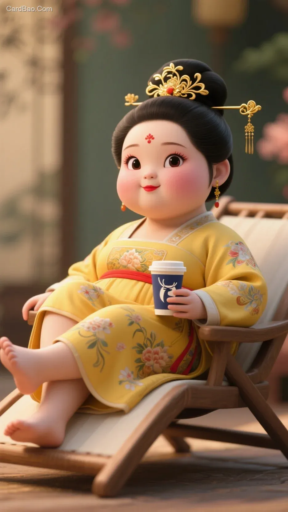 3D渲染风格,超现实主义,一个胖嘟嘟很可爱的古代女子,五官精致,大眼睛双眼皮,眉型为细长的柳叶眉,眉色自然,双眸明亮有神,呈杏仁状,透着温婉灵动之感,鼻梁小巧精致,恰到好处地勾勒出面部立体感,唇形饱满。途有鲜红的口脂,嘴角微微上扬,似带着一抹浅笑,流露出亲和气质。她的头发乌黑亮丽,梳成了经典的唐代倭堕髻,倭堕髻插鎏金蔓草纹头饰,发髻高耸且富有层次感,线条优美流畅,一侧别着精美的金色发簪,发簪造型繁复,雕琢着精致纹样,末端垂有小巧的坠饰,随着人物动作微微晃动,另一侧装饰有华丽的金质花钿头饰,增添了几分雍容华贵。