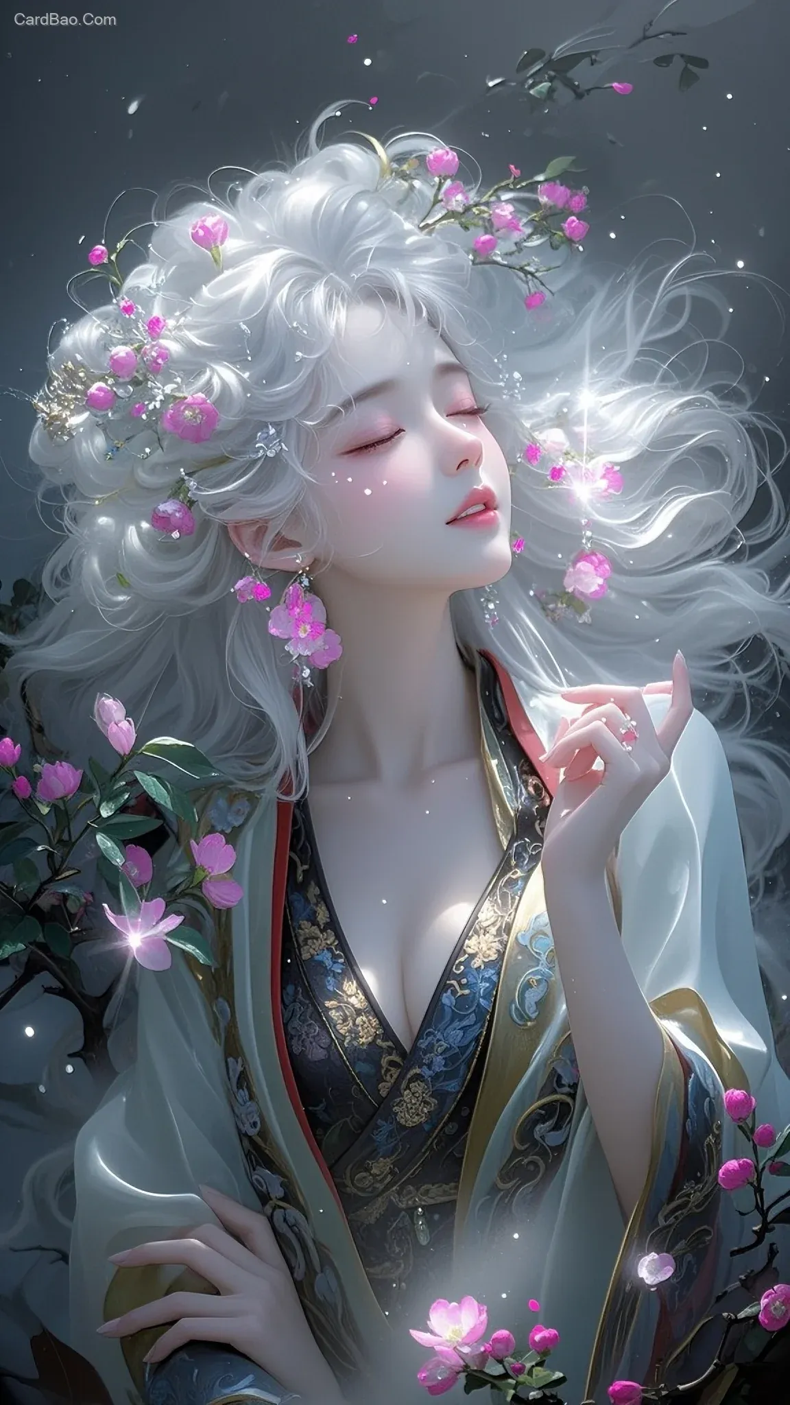 美丽的中国仙女,白色长发,飘逸,蓬松,幻想艺术风格,超现实的插图风格,精致的线条,神秘,晶莹剔透的皮肤纹理,长长的飘逸的头发装饰着白粉色小碎花,闭着眼睛,梦幻般的表情,被闪闪发光的光粒子包围,32k,3d模型,虚拟引擎