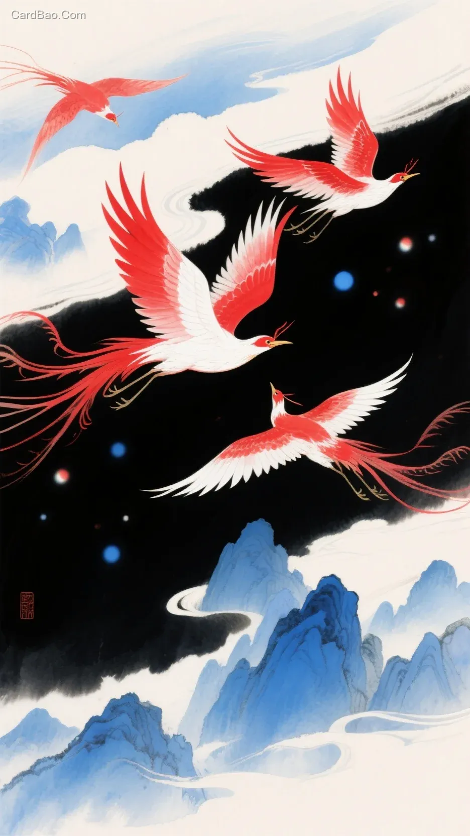 即梦画师,国画面感很强,画东方映画,九天朱雀,能飞翔鸟红白蓝光光驱活跃点,有黑色的,色彩搭配红黑蓝白很美丽动人风景图,超高清图水彩画,大师级别图片制作音乐视频