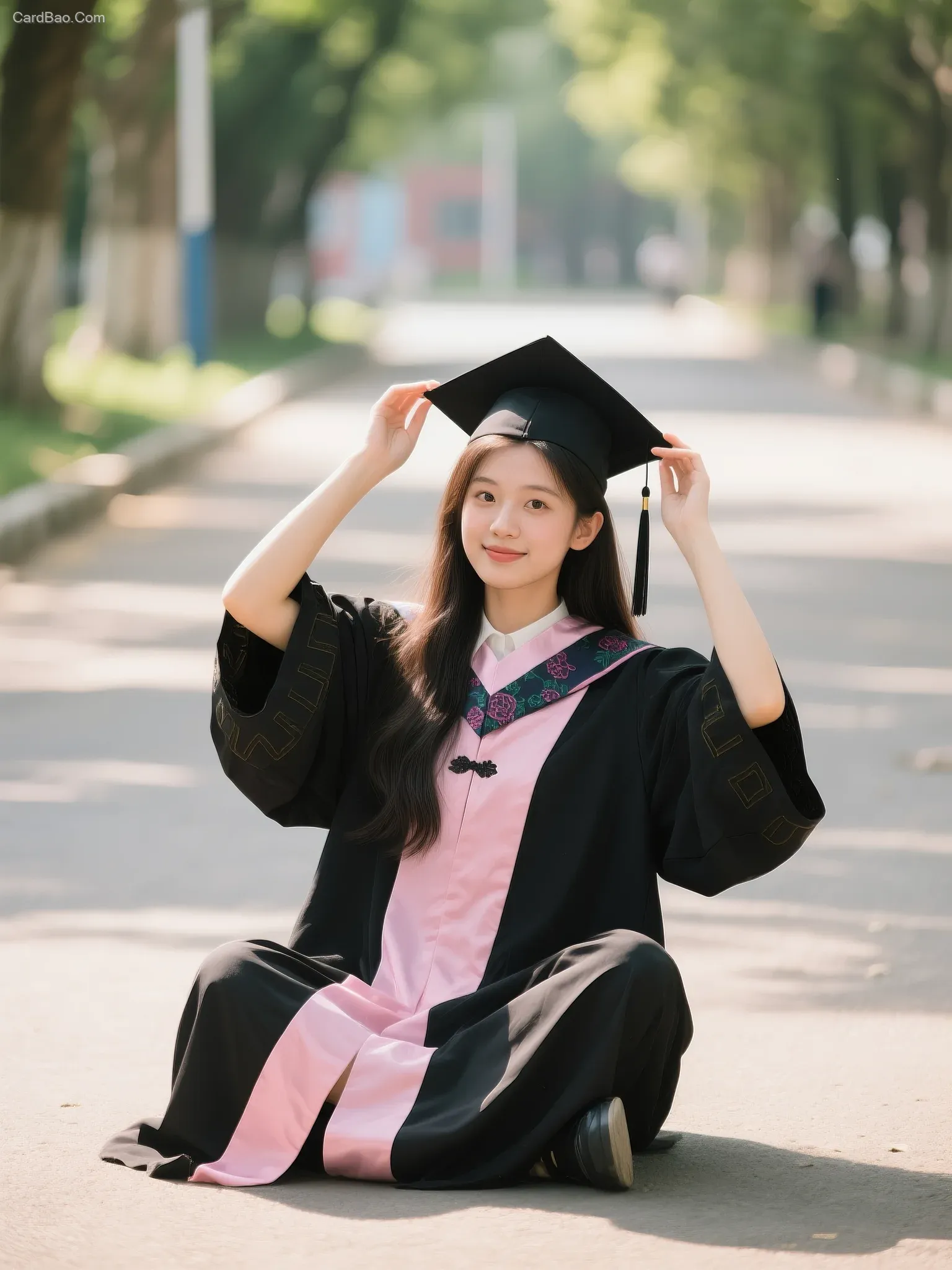 年轻女性,长发披肩,妆容精致, 身着黑色学士服,粉色学位服垂布搭配带有花纹的领口,正坐在户外地面上,双手扶着黑色学士帽,背景为模糊的校园道路和绿意,阳光洒落