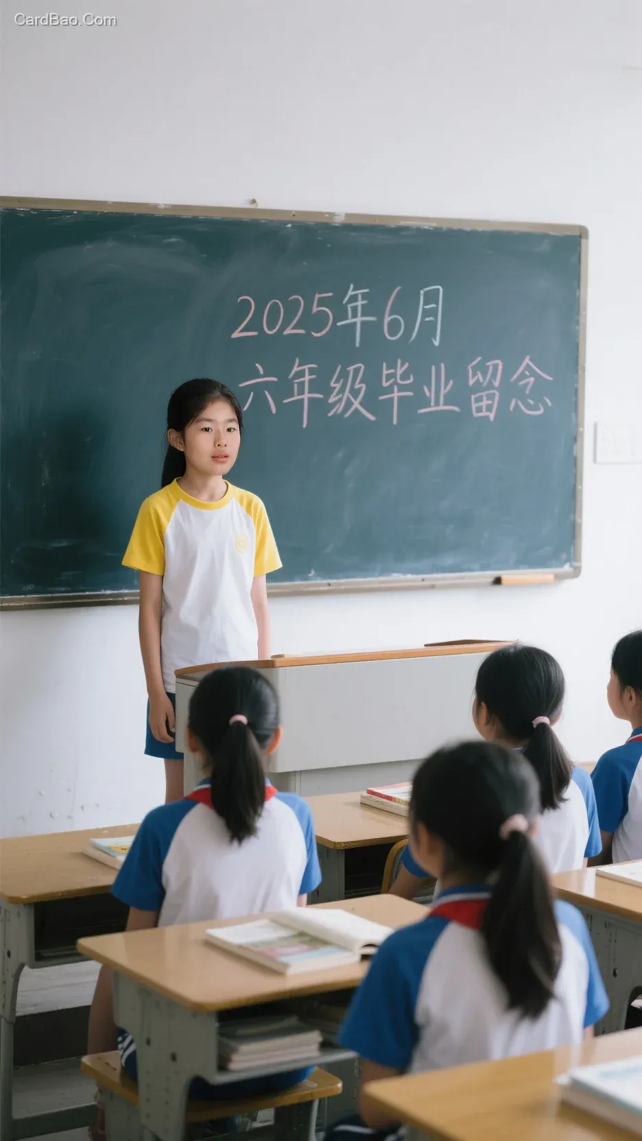 ##二零二五年六月,一位12岁的小学女同学,身穿黄白相间色上衣,站在教室讲台前,双手自然下垂,平视看着教室下面的同学,桌子上有书本,其他穿着同样衣服的同学坐在桌前看着她的发言,背景是白色的墙和黑板,黑板上用粉笔写着“2025年6月六年级毕业留念”用主题照片,纪实摄影,近景,画面只有显示书桌桌面和上半身,高清,简洁