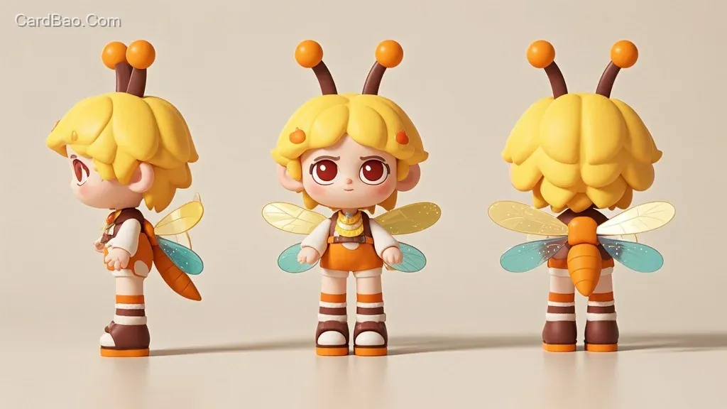 三视图,盲盒,埃及蜻蜓,IP,3D,三视图,前视图,侧视图,后视图,盲框,超高清,大眼睛,可爱的表情,脸红,黄头发,干净的背景,