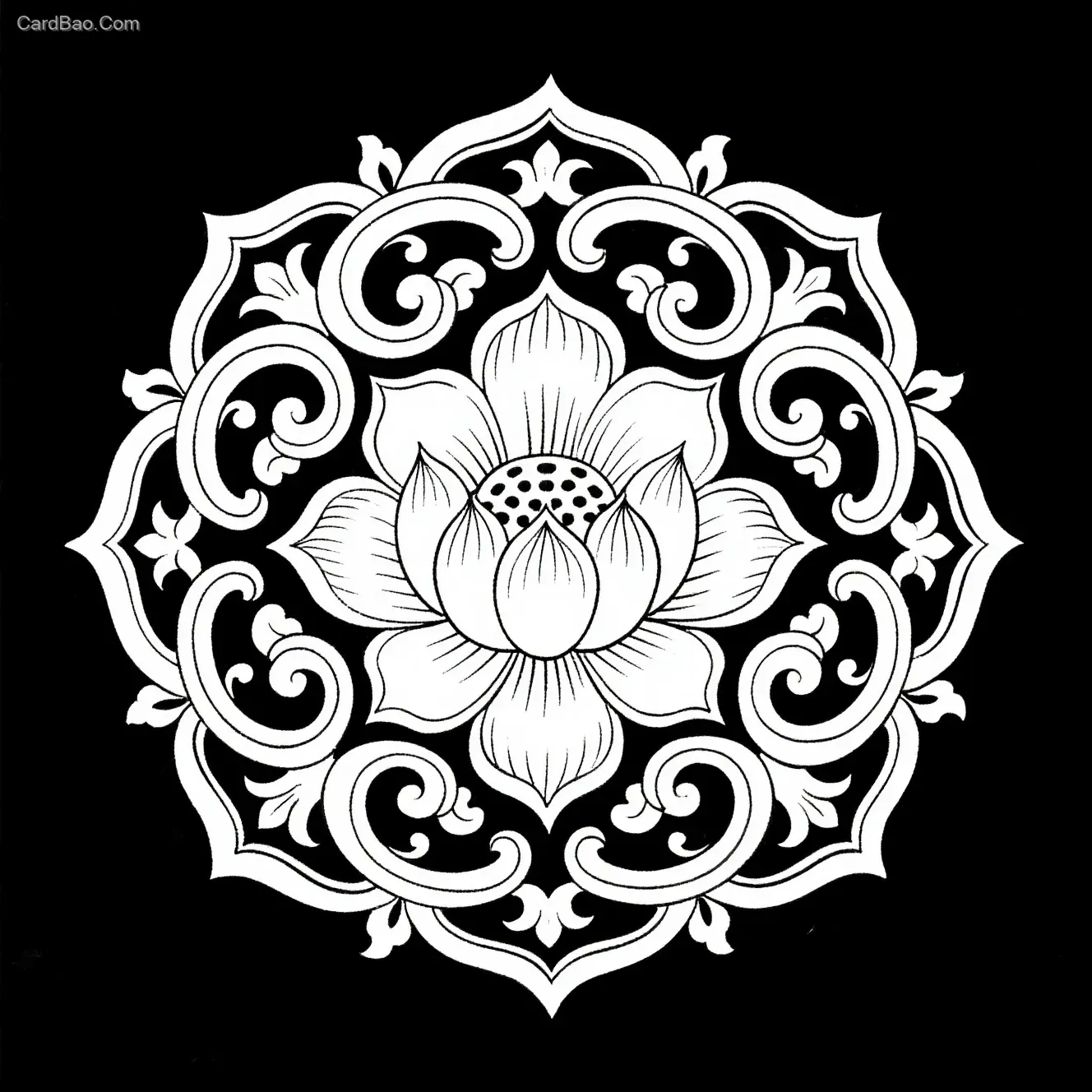 对称式宝相花主体纹样,搭配莲花与卷草纹组合,纯白描勾线技法,线条粗细变化自然,传统团花纹样结构,工笔画未上色线稿,临摹专用图样